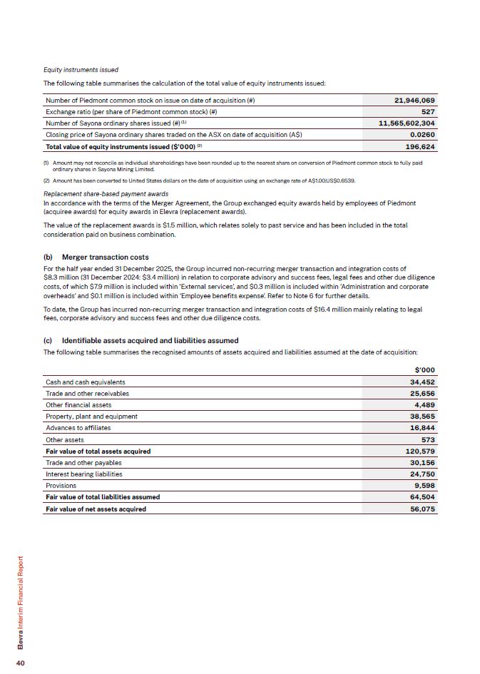 Equity instruments issued  The following table summarises the calculation of the total value of equity instruments issued:  Number of Piedmont common stock on issue on date of acquisition (#)  21,946,069  Exchange ratio (per share of Piedmont common stock) (#)  527  Number of Sayona ordinary shares issued (#) (1)  11,565,602,304  Closing price of Sayona ordinary shares traded on the ASX on date of acquisition (A$)  0.0260  Total value of equity instruments issued ($’000) (2)  196,624  Amount may not reconcile as individual shareholdings have been rounded up to the nearest share on conversion of Piedmont common stock to fully paid ordinary shares in Sayona Mining Limited.  Amount has been converted to United States dollars on the date of acquisition using an exchange rate of A$1.00:US$0.6539.  Replacement share-based payment awards  In accordance with the terms of the Merger Agreement, the Group exchanged equity awards held by employees of Piedmont (acquiree awards) for equity awards in Elevra (replacement awards).  The value of the replacement awards is $1.5 million, which relates solely to past service and has been included in the total consideration paid on business combination.  Merger transaction costs  For the half year ended 31 December 2025, the Group incurred non-recurring merger transaction and integration costs of  $8.3 million (31 December 2024: $3.4 million) in relation to corporate advisory and success fees, legal fees and other due diligence costs, of which $7.9 million is included within ‘External services’, and $0.3 million is included within ‘Administration and corporate overheads’ and $0.1 million is included within ‘Employee benefits expense’. Refer to Note 6 for further details.  To date, the Group has incurred non-recurring merger transaction and integration costs of $16.4 million mainly relating to legal fees, corporate advisory and success fees and other due diligence costs.  Identifiable assets acquired and liabilities assumed  The following table summarises the recognised amounts of assets acquired and liabilities assumed at the date of acquisition:  $‘000  Cash and cash equivalents  34,452  Trade and other receivables  25,656  Other financial assets  4,489  Property, plant and equipment  38,565  Advances to affiliates  16,844  Other assets  573  Fair value of total assets acquired  120,579  Trade and other payables  30,156  Interest bearing liabilities  24,750  Provisions  9,598  Fair value of total liabilities assumed  64,504  Fair value of net assets acquired  56,075  Elevra Interim Financial Report  40
