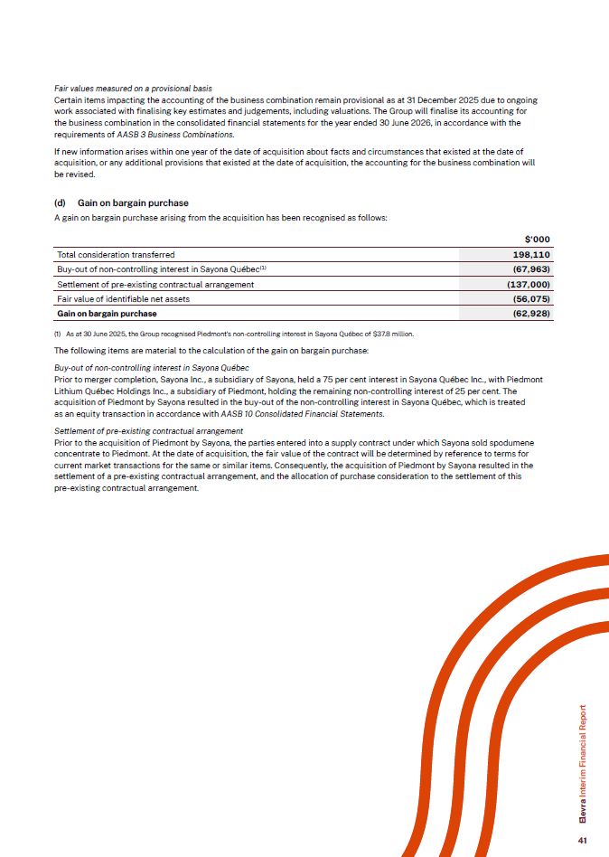 Fair values measured on a provisional basis  Certain items impacting the accounting of the business combination remain provisional as at 31 December 2025 due to ongoing work associated with finalising key estimates and judgements, including valuations. The Group will finalise its accounting for the business combination in the consolidated financial statements for the year ended 30 June 2026, in accordance with the requirements of AASB 3 Business Combinations.  If new information arises within one year of the date of acquisition about facts and circumstances that existed at the date of acquisition, or any additional provisions that existed at the date of acquisition, the accounting for the business combination will be revised.  (d) Gain on bargain purchase  A gain on bargain purchase arising from the acquisition has been recognised as follows:  $‘000  Total consideration transferred  198,110  Buy-out of non-controlling interest in Sayona Québec(1)  (67,963)  Settlement of pre-existing contractual arrangement  (137,000)  Fair value of identifiable net assets  (56,075)  Gain on bargain purchase  (62,928)  (1) As at 30 June 2025, the Group recognised Piedmont’s non-controlling interest in Sayona Québec of $37.8 million.  The following items are material to the calculation of the gain on bargain purchase:  Buy-out of non-controlling interest in Sayona Québec  Prior to merger completion, Sayona Inc., a subsidiary of Sayona, held a 75 per cent interest in Sayona Québec Inc., with Piedmont Lithium Québec Holdings Inc., a subsidiary of Piedmont, holding the remaining non-controlling interest of 25 per cent. The acquisition of Piedmont by Sayona resulted in the buy-out of the non-controlling interest in Sayona Québec, which is treated  as an equity transaction in accordance with AASB 10 Consolidated Financial Statements.  Settlement of pre-existing contractual arrangement  Prior to the acquisition of Piedmont by Sayona, the parties entered into a supply contract under which Sayona sold spodumene concentrate to Piedmont. At the date of acquisition, the fair value of the contract will be determined by reference to terms for current market transactions for the same or similar items. Consequently, the acquisition of Piedmont by Sayona resulted in the settlement of a pre-existing contractual arrangement, and the allocation of purchase consideration to the settlement of this pre-existing contractual arrangement.  Elevra Interim Financial Report  41