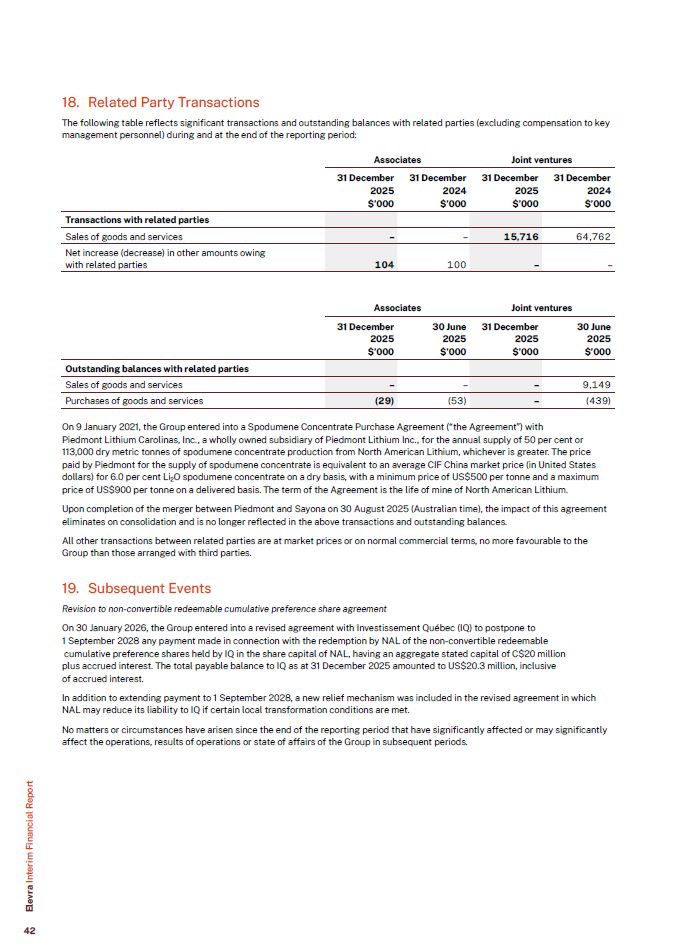 18. Related Party Transactions  The following table reflects significant transactions and outstanding balances with related parties (excluding compensation to key management personnel) during and at the end of the reporting period:  Associates Joint ventures  Transactions with related parties  Sales of goods and services  –  –  15,716  64,762  Net increase (decrease) in other amounts owing with related parties  104  100  –  –  31 December  2025  $’000  31 December  2024  $’000  31 December  2025  $’000  31 December  2024  $’000  Associates  Joint ventures  31 December  30 June  31 December  30 June  2025  2025  2025  2025  $’000  $’000  $’000  $’000  Outstanding balances with related parties  Sales of goods and services  –  –  –  9,149  Purchases of goods and services  (29)  (53)  –  (439)  On 9 January 2021, the Group entered into a Spodumene Concentrate Purchase Agreement (“the Agreement”) with Piedmont Lithium Carolinas, Inc., a wholly owned subsidiary of Piedmont Lithium Inc., for the annual supply of 50 per cent or  113,000 dry metric tonnes of spodumene concentrate production from North American Lithium, whichever is greater. The price paid by Piedmont for the supply of spodumene concentrate is equivalent to an average CIF China market price (in United States dollars) for 6.0 per cent Li2O spodumene concentrate on a dry basis, with a minimum price of US$500 per tonne and a maximum price of US$900 per tonne on a delivered basis. The term of the Agreement is the life of mine of North American Lithium.  Upon completion of the merger between Piedmont and Sayona on 30 August 2025 (Australian time), the impact of this agreement eliminates on consolidation and is no longer reflected in the above transactions and outstanding balances.  All other transactions between related parties are at market prices or on normal commercial terms, no more favourable to the Group than those arranged with third parties.  19. Subsequent Events  Revision to non-convertible redeemable cumulative preference share agreement  On 30 January 2026, the Group entered into a revised agreement with Investissement Québec (IQ) to postpone to  1 September 2028 any payment made in connection with the redemption by NAL of the non-convertible redeemable cumulative preference shares held by IQ in the share capital of NAL, having an aggregate stated capital of C$20 million plus accrued interest. The total payable balance to IQ as at 31 December 2025 amounted to US$20.3 million, inclusive of accrued interest.  In addition to extending payment to 1 September 2028, a new relief mechanism was included in the revised agreement in which NAL may reduce its liability to IQ if certain local transformation conditions are met.  No matters or circumstances have arisen since the end of the reporting period that have significantly affected or may significantly affect the operations, results of operations or state of affairs of the Group in subsequent periods.  Elevra Interim Financial Report  42