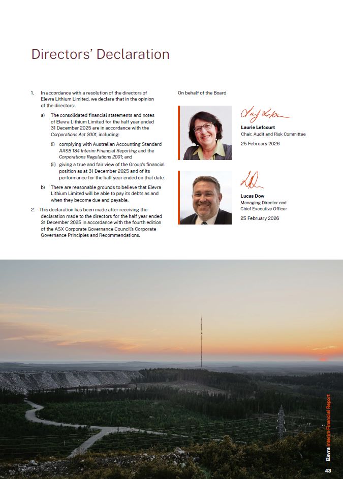 In accordance with a resolution of the directors of Elevra Lithium Limited, we declare that in the opinion of the directors:  The consolidated financial statements and notes of Elevra Lithium Limited for the half year ended 31 December 2025 are in accordance with the Corporations Act 2001, including:  complying with Australian Accounting Standard AASB 134 Interim Financial Reporting and the Corporations Regulations 2001; and  giving a true and fair view of the Group’s financial position as at 31 December 2025 and of its performance for the half year ended on that date.  There are reasonable grounds to believe that Elevra Lithium Limited will be able to pay its debts as and when they become due and payable.  This declaration has been made after receiving the declaration made to the directors for the half year ended 31 December 2025 in accordance with the fourth edition of the ASX Corporate Governance Council’s Corporate Governance Principles and Recommendations.  On behalf of the Board  Directors’ Declaration  Lucas Dow  Managing Director and Chief Executive Officer  25 February 2026  Laurie Lefcourt  Chair, Audit and Risk Committee  25 February 2026  Elevra Interim Financial Report  43