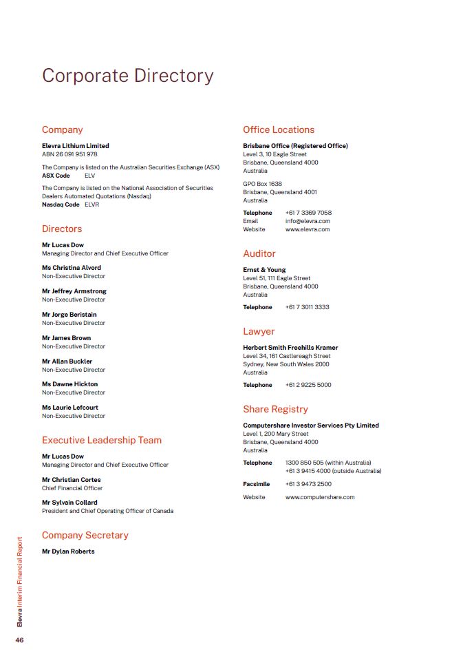 Corporate Directory  Company  Elevra Lithium Limited  ABN 26 091 951 978  The Company is listed on the Australian Securities Exchange (ASX)  ASX Code ELV  The Company is listed on the National Association of Securities Dealers Automated Quotations (Nasdaq)  Nasdaq Code ELVR  Directors  Mr Lucas Dow  Managing Director and Chief Executive Officer  Ms Christina Alvord  Non-Executive Director  Mr Jeffrey Armstrong  Non-Executive Director  Mr Jorge Beristain  Non-Executive Director  Mr James Brown  Non-Executive Director  Mr Allan Buckler  Non-Executive Director  Ms Dawne Hickton  Non-Executive Director  Ms Laurie Lefcourt  Non-Executive Director  Executive Leadership Team  Mr Lucas Dow  Managing Director and Chief Executive Officer  Mr Christian Cortes  Chief Financial Officer  Mr Sylvain Collard  President and Chief Operating Officer of Canada  Company Secretary  Mr Dylan Roberts  Telephone Email Website  Telephone  Facsimile  Website  Office Locations  Brisbane Office (Registered Office)  Level 3, 10 Eagle Street  Brisbane, Queensland 4000 Australia  GPO Box 1638  Brisbane, Queensland 4001 Australia  +61 7 3369 7058  info@elevra.com www.elevra.com  Auditor  Ernst & Young  Level 51, 111 Eagle Street  Brisbane, Queensland 4000 Australia  Telephone +61 7 3011 3333  Lawyer  Herbert Smith Freehills Kramer Level 34, 161 Castlereagh Street Sydney, New South Wales 2000 Australia  Telephone +61 2 9225 5000  Share Registry  Computershare Investor Services Pty Limited  Level 1, 200 Mary Street  Brisbane, Queensland 4000 Australia  1300 850 505 (within Australia)  +61 3 9415 4000 (outside Australia)  +61 3 9473 2500  www.computershare.com  Elevra Interim Financial Report  46