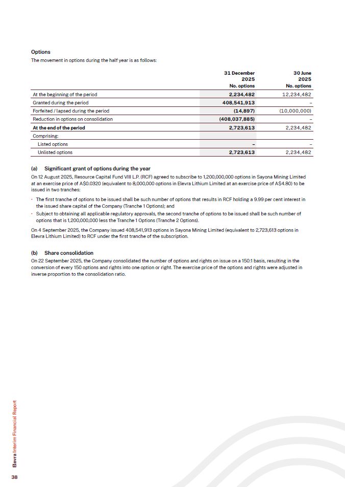 Options  The movement in options during the half year is as follows:  At the beginning of the period  2,234,482  12,234,482  Granted during the period  408,541,913  –  Forfeited / lapsed during the period  (14,897)  (10,000,000)  Reduction in options on consolidation  (408,037,885)  –  At the end of the period  2,723,613  2,234,482  Comprising:  Listed options  –  –  Unlisted options  2,723,613  2,234,482  31 December  2025  No. options  30 June  2025  No. options  Significant grant of options during the year  On 12 August 2025, Resource Capital Fund VIII L.P. (RCF) agreed to subscribe to 1,200,000,000 options in Sayona Mining Limited at an exercise price of A$0.0320 (equivalent to 8,000,000 options in Elevra Lithium Limited at an exercise price of A$4.80) to be issued in two tranches:  The first tranche of options to be issued shall be such number of options that results in RCF holding a 9.99 per cent interest in the issued share capital of the Company (Tranche 1 Options); and  Subject to obtaining all applicable regulatory approvals, the second tranche of options to be issued shall be such number of options that is 1,200,000,000 less the Tranche 1 Options (Tranche 2 Options).  On 4 September 2025, the Company issued 408,541,913 options in Sayona Mining Limited (equivalent to 2,723,613 options in Elevra Lithium Limited) to RCF under the first tranche of the subscription.  (b) Share consolidation  On 22 September 2025, the Company consolidated the number of options and rights on issue on a 150:1 basis, resulting in the conversion of every 150 options and rights into one option or right. The exercise price of the options and rights were adjusted in inverse proportion to the consolidation ratio.  Elevra Interim Financial Report  38