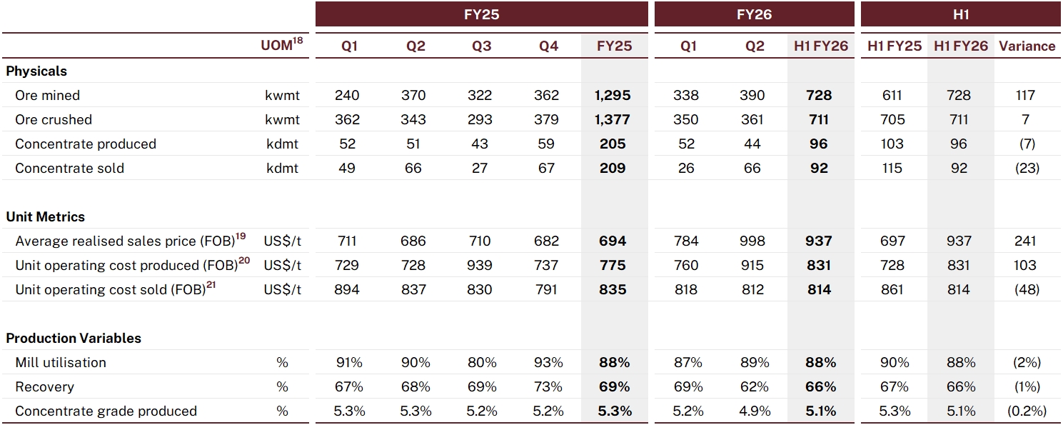 NAL produced 96,156 dry metric tonnes (dmt) of spodumene concentrate during the FY26 half year, reflecting continued stable operations, with production 7% lower than the prior corresponding period (PCP) reflecting the impact of ore availability challenges which are of a temporary nature rather than structural issues.
