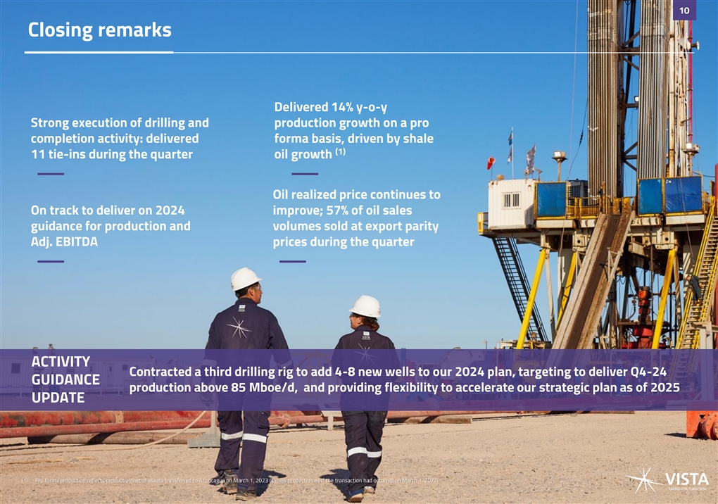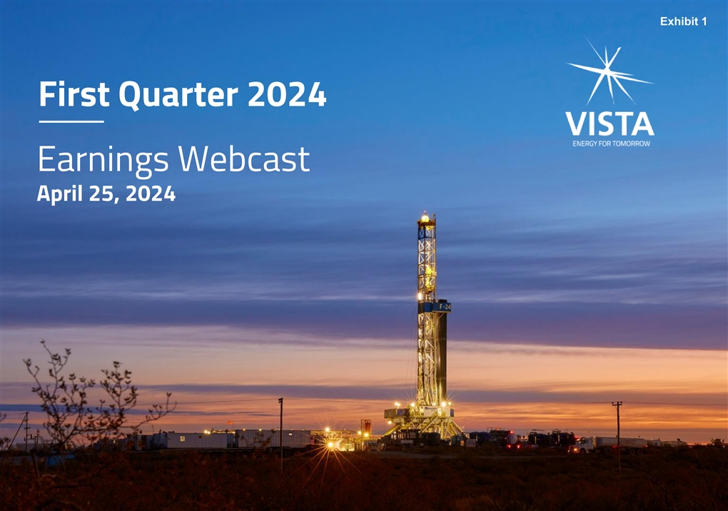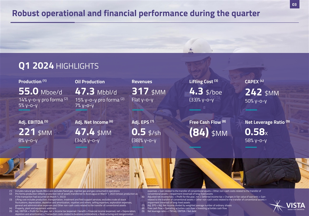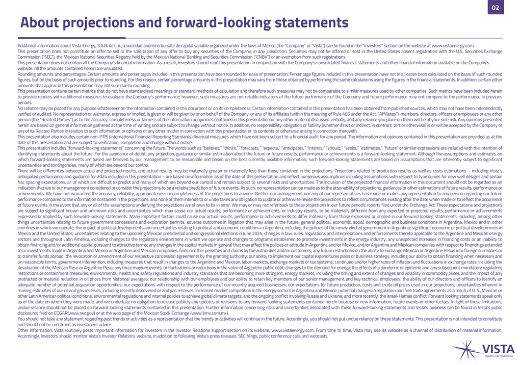02 About projections and forward-looking statements Additional information about Vista Energy, S.A.B. de C.V., a sociedad anónima bursátil de capital variable organized under the laws of Mexico (the“Company” or“Vista”) can be found in the“Investors” section on the website at www.vistaenergy.com. This presentation does not constitute an offer to sell or the solicitation of any offer to buy any securities of the Company, in any jurisdiction. Securities may not be offered or sold in the United States absent registration with the U.S. Securities Exchange Commission(“SEC”), the Mexican National Securities Registry held by the Mexican National Banking and Securities Commission(“CNBV”) or an exemption from such registrations. This presentation does not contain all theCompany’s financial information. As a result, investors should read this presentation in conjunction with theCompany’s consolidated financial statements and other financial information available on theCompany’s website. All the amounts contained herein are unaudited. Rounding amounts and percentages: Certain amounts and percentages included in this presentation have been rounded for ease of presentation. Percentage figures included in this presentation have not in all cases been calculated on the basis of such rounded figures, but on the basis of such amounts prior to rounding. For this reason, certain percentage amounts in this presentation may vary from those obtained by performing the same calculations using the figures in the financial statements. In addition, certain other amounts that appear in this presentation may not sum due to rounding. This presentation contains certain metrics that do not have standardized meanings or standard methods of calculation and therefore such measures may not be comparable to similar measures used by other companies. Such metrics have been included herein to provide readers with additional measures to evaluate theCompany’s performance; however, such measures are not reliable indicators of the future performance of the Company and future performance may not compare to the performance in previous periods. No reliance may be placed for any purpose whatsoever on the information contained in this document or on its completeness. Certain information contained in this presentation has been obtained from published sources, which may not have been independently verified or audited. No representation or warranty, express or implied, is given or will be given by or on behalf of the Company, or any of its affiliates (within the meaning of Rule 405 under the Act,“Affiliates”), members, directors, officers or employees or any other person (the“RelatedParties”) as to the accuracy, completeness or fairness of the information or opinions contained in this presentation or any other material discussed verbally, and any reliance you place on them will be at your sole risk. Any opinions presented herein are based on general information gathered at the time of writing and are subject to change without notice. In addition, no responsibility, obligation or liability (whether direct or indirect, in contract, tort or otherwise) is or will be accepted by the Company or any of its Related Parties in relation to such information or opinions or any other matter in connection with this presentation or its contents or otherwise arising in connection therewith. This presentation also includes certain non-IFRS (International Financial Reporting Standards) financial measures which have not been subject to a financial audit for any period. The information and opinions contained in this presentation are provided as at the date of this presentation and are subject to verification, completion and change without notice. This presentation includes“forward-lookingstatements” concerning the future. The words such as“believes,”“thinks,”“forecasts,”“expects,”“anticipates,”“intends,”“should,”“seeks,”“estimates,”“future” or similar expressions are included with the intention of identifying statements about the future. For the avoidance of doubt, any projection, guidance or similar estimation about the future or future results, performance or achievements is a forward-looking statement. Although the assumptions and estimates on which forward-looking statements are based are believed by our management to be reasonable and based on the best currently available information, such forward-looking statements are based on assumptions that are inherently subject to significant uncertainties and contingencies, many of which are beyond our control. There will be differences between actual and projected results, and actual results may be materially greater or materially less than those contained in the projections. Projections related to production results as well as costs estimations– includingVista’s anticipated performance and guidance for 2024 included in this presentation– are based on information as of the date of this presentation and reflect numerous assumptions including assumptions with respect to type curves for new well designs and certain frac spacing expectations, all of which are difficult to predict and many of which are beyond our control and remain subject to several risks and uncertainties. The inclusion of the projected financial information in this document should not be regarded as an indication that we or our management considered or consider the projections to be a reliable prediction of future events. As such, no representation can be made as to the attainability of projections, guidances or other estimations of future results, performance or achievements. We have not warranted the accuracy, reliability, appropriateness or completeness of the projections to anyone. Neither our management nor any of our representatives has made or makes any representation to any person regarding our future performance compared to the information contained in 
