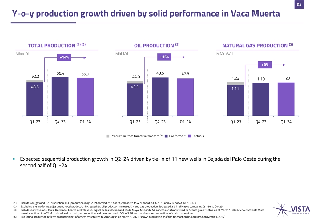 03 Robust operational and financial performance during the quarter Q1 2024 HIGHLIGHTS (1) (3) (4) Production Revenues Lifting Cost Oil Production CAPEX 55.0 Mboe/d 317 $MM 4.3 $/boe 47.3 Mbbl/d 242 $MM (2) (2) 14% y-o-y pro forma 15% y-o-y pro forma Flat y-o-y (33)% y-o-y 50% y-o-y 5% y-o-y 7% y-o-y (5) (6) (7) (8) (9) Adj. EBITDA Adj. Net Income Adj. EPS Free Cash Flow Net Leverage Ratio 221 $MM 47.4 $MM 0.5 $/sh 0.58x (84) $MM 8% y-o-y (34)% y-o-y (38)% y-o-y 58% y-o-y (1) Includes natural gas liquids (NGL) and excludes flared gas, injected gas and gas consumed in operations expenses + Gain related to the transfer of conventional assets + Other non-cash costs related to the transfer of (2) Pro forma production reflects production net of assets transferred to Aconcagua on March 1, 2023 (shows production as conventional assets + Impairment (reversal) of long-lived assets if the transaction had occurred on March 1, 2022) (6) Adjusted net income/loss = Profit for the year, net + Deferred income tax + Changes in fair value of warrants + Gain (3) Lifting cost includes production, transportation, treatment and field support services; excludes crude oil stock related to the transfer of conventional assets + Other non-cash costs related to the transfer of conventional assets + fluctuations, depreciation, depletion and amortization, royalties and others, selling expenses, exploration expenses, impairment (reversal) of long-lived assets general and administrative expenses and Other non-cash costs related to the transfer of conventional assets (7) Adj. EPS = Adj. Net Income divided by weighted average number of ordinary shares (4) Property, plant and equipment additions (8) Free cash flow = Operating activities cash flow + Investing activities cash flow (5) Adj. EBITDA = Profit for the year, net + Income tax (expense) / benefit + Financial income (expense), net + Depreciation, (9) Net leverage ratio = LTM Adj. EBITDA / Net debt depletion and amortization + Transaction costs related to business combinations + Restructuring and reorganization