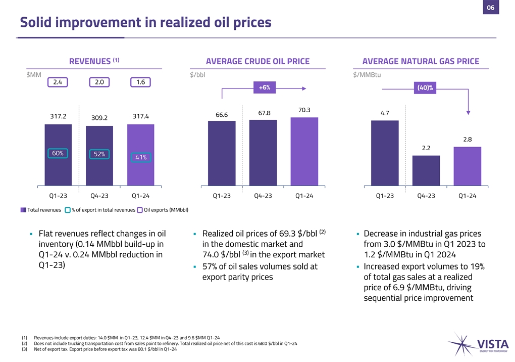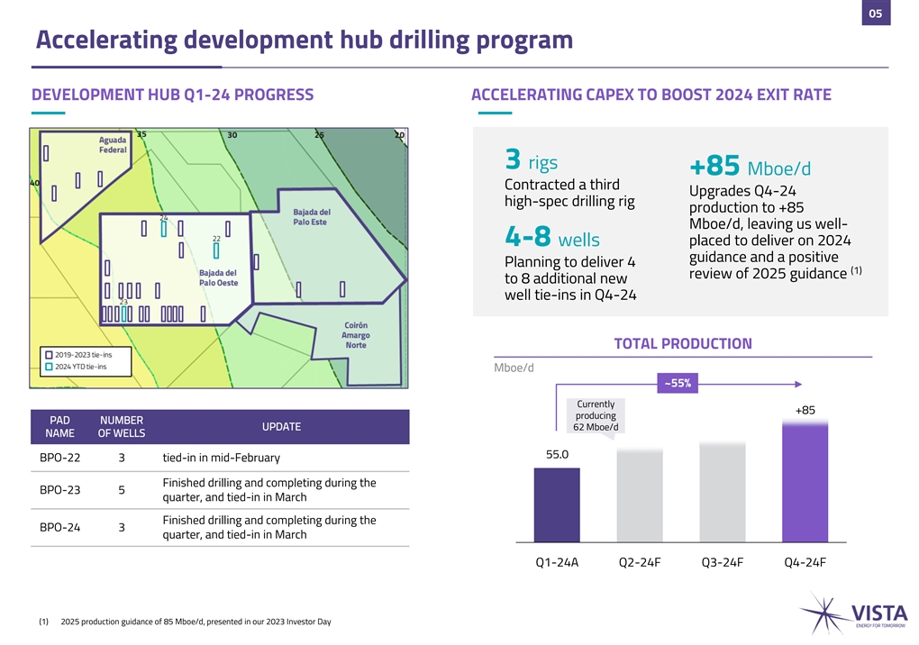 04 Y-o-y production growth driven by solid performance in Vaca Muerta (1) (2) (2) (2) TOTAL PRODUCTION OIL PRODUCTION NATURAL GAS PRODUCTION Mboe/d Mbbl/d MMm3/d +15% +14% +8% 48.5 56.4 55.0 47.3 52.2 44.0 1.20 1.23 1.19 41.1 48.5 1.11 Q1-23 Q4-23 Q1-24 Q1-23 Q4-23 Q1-24 Q1-23 Q4-23 Q1-24 (3) (4) Production from transferred assets Pro forma Actuals ▪ Expected sequential production growth in Q2-24 driven by tie-in of 11 new wells in Bajada del Palo Oeste during the second half of Q1-24 (1) Includes oil, gas and LPG production. LPG production in Q1 2024 totaled 212 boe/d, compared to 409 boe/d in Q4 2023 and 407 boe/d in Q1 2023 (2) Excluding the pro forma adjustment, total production increased 5%, oil production increased 7% and gas production decreased 3%, in all cases comparing Q1-24 to Q1-23 (3) Includes Entre Lomas, Jarilla Quemada, Charco del Palenque, Jagüel de los Machos and 25 de Mayo-Medanito SE concessions transferred to Aconcagua, effective as of March 1, 2023. Since that date Vista remains entitled to 40% of crude oil and natural gas production and reserves, and 100% of LPG and condensates production, of such concessions (4) Pro forma production reflects production net of assets transferred to Aconcagua on March 1, 2023 (shows production as if the transaction had occurred on March 1, 2022)