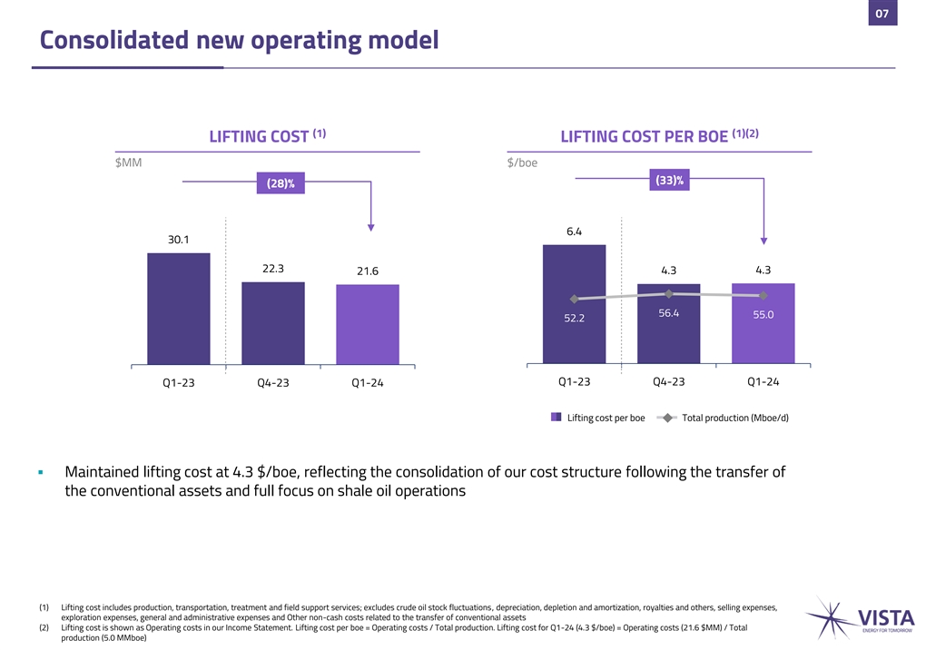 06 Solid improvement in realized oil prices (1) REVENUES AVERAGE CRUDE OIL PRICE AVERAGE NATURAL GAS PRICE $MM $/bbl $/MMBtu 2.4 2.0 1.6 +6% (40)% 70.3 67.8 4.7 66.6 317.2 317.4 309.2 2.8 2.2 60% 52% 41% Q1-23 Q4-23 Q1-24 Q1-23 Q4-23 Q1-24 Q1-23 Q4-23 Q1-24 Total revenues % of export in total revenues Oil exports (MMbbl) (2) ▪ Flat revenues reflect changes in oil ▪ Realized oil prices of 69.3 $/bbl▪ Decrease in industrial gas prices inventory (0.14 MMbbl build-up in in the domestic market and from 3.0 $/MMBtu in Q1 2023 to (3) Q1-24 v. 0.24 MMbbl reduction in 74.0 $/bbl in the export market 1.2 $/MMBtu in Q1 2024 Q1-23) ▪ 57% of oil sales volumes sold at ▪ Increased export volumes to 19% export parity prices of total gas sales at a realized price of 6.9 $/MMBtu, driving sequential price improvement (1) Revenues include export duties: 14.0 $MM in Q1-23, 12.4 $MM in Q4-23 and 9.6 $MM Q1-24 (2) Does not include trucking transportation cost from sales point to refinery. Total realized oil price net of this cost is 68.0 $/bbl in Q1-24 (3) Net of export tax. Export price before export tax was 80.1 $/bbl in Q1-24