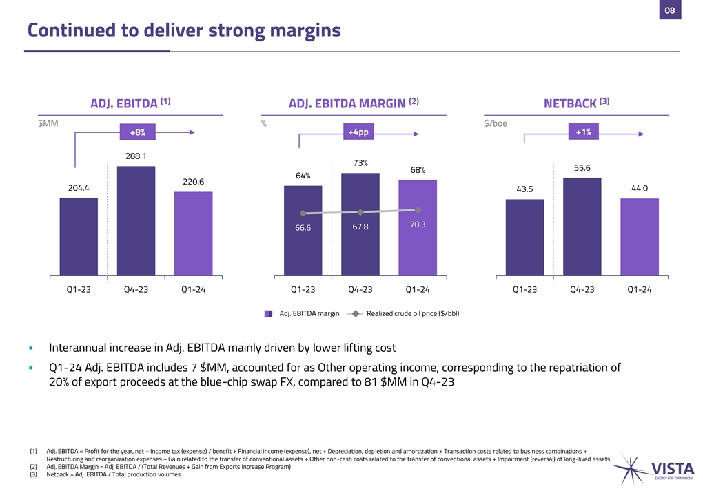 07 Consolidated new operating model (1) (1)(2) LIFTING COST LIFTING COST PER BOE $MM $/boe (33)% (28)% 6.4 30.1 22.3 4.3 4.3 21.6 56.4 55.0 52.2 Q1-23 Q4-23 Q1-24 Q1-23 Q4-23 Q1-24 Lifting cost per boe Total production (Mboe/d) ▪ Maintained lifting cost at 4.3 $/boe, reflecting the consolidation of our cost structure following the transfer of the conventional assets and full focus on shale oil operations (1) Lifting cost includes production, transportation, treatment and field support services; excludes crude oil stock fluctuations, depreciation, depletion and amortization, royalties and others, selling expenses, exploration expenses, general and administrative expenses and Other non-cash costs related to the transfer of conventional assets (2) Lifting cost is shown as Operating costs in our Income Statement. Lifting cost per boe = Operating costs / Total production. Lifting cost for Q1-24 (4.3 $/boe) = Operating costs (21.6 $MM) / Total production (5.0 MMboe)