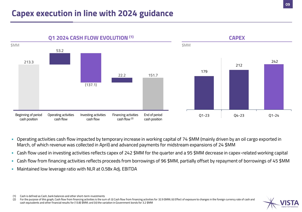 08 Continued to deliver strong margins (1) (2) (3) ADJ. EBITDA ADJ. EBITDA MARGIN NETBACK $MM % $/boe +4pp +1% +8% p.p. p.p. 288.1 73% 55.6 68% 64% 220.6 204.4 44.0 43.5 70.3 67.8 66.6 Q1-23 Q4-23 Q1-24 Q1-23 Q4-23 Q1-24 Q1-23 Q4-23 Q1-24 Adj. EBITDA margin Realized crude oil price ($/bbl) ▪ Interannual increase in Adj. EBITDA mainly driven by lower lifting cost ▪ Q1-24 Adj. EBITDA includes 7 $MM, accounted for as Other operating income, corresponding to the repatriation of 20% of export proceeds at the blue-chip swap FX, compared to 81 $MM in Q4-23 (1) Adj. EBITDA = Profit for the year, net + Income tax (expense) / benefit + Financial income (expense), net + Depreciation, depletion and amortization + Transaction costs related to business combinations + Restructuring and reorganization expenses + Gain related to the transfer of conventional assets + Other non-cash costs related to the transfer of conventional assets + Impairment (reversal) of long-lived assets (2) Adj. EBITDA Margin = Adj. EBITDA / (Total Revenues + Gain from Exports Increase Program) (3) Netback = Adj. EBITDA / Total production volumes
