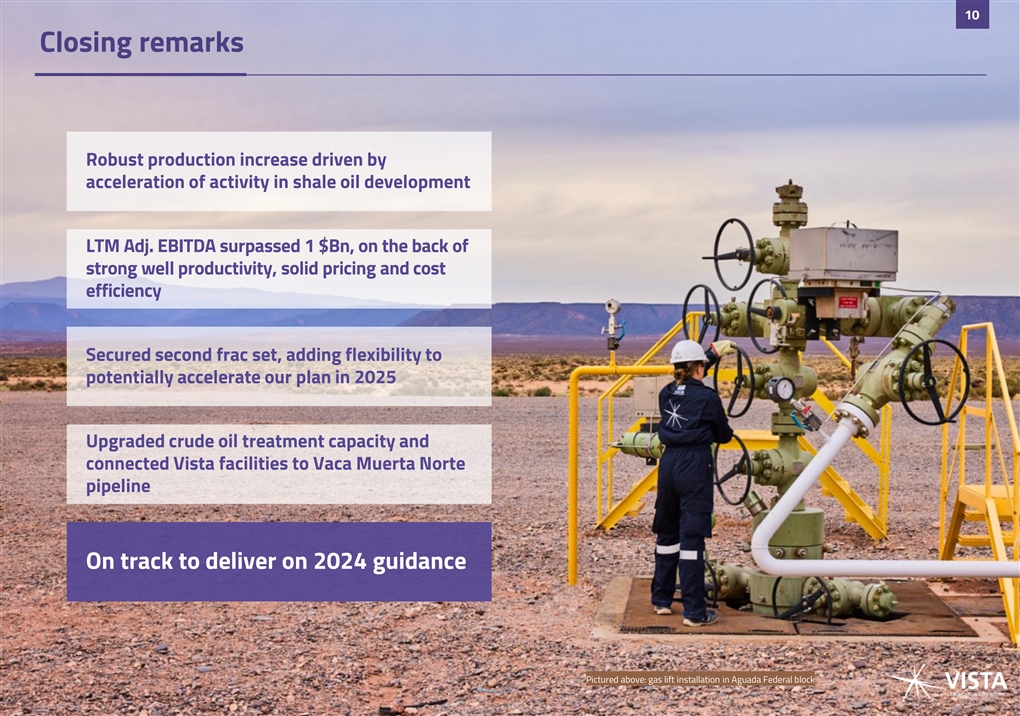 10 Closing remarks Robust production increase driven by acceleration of activity in shale oil development LTM Adj. EBITDA surpassed 1 $Bn, on the back of strong well productivity, solid pricing and cost efficiency Secured second frac set, adding flexibility to potentially accelerate our plan in 2025 Upgraded crude oil treatment capacity and connected Vista facilities to Vaca Muerta Norte pipeline On track to deliver on 2024 guidance Pictured above: gas lift installation in Aguada Federal block