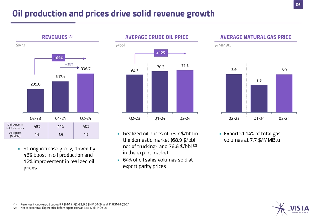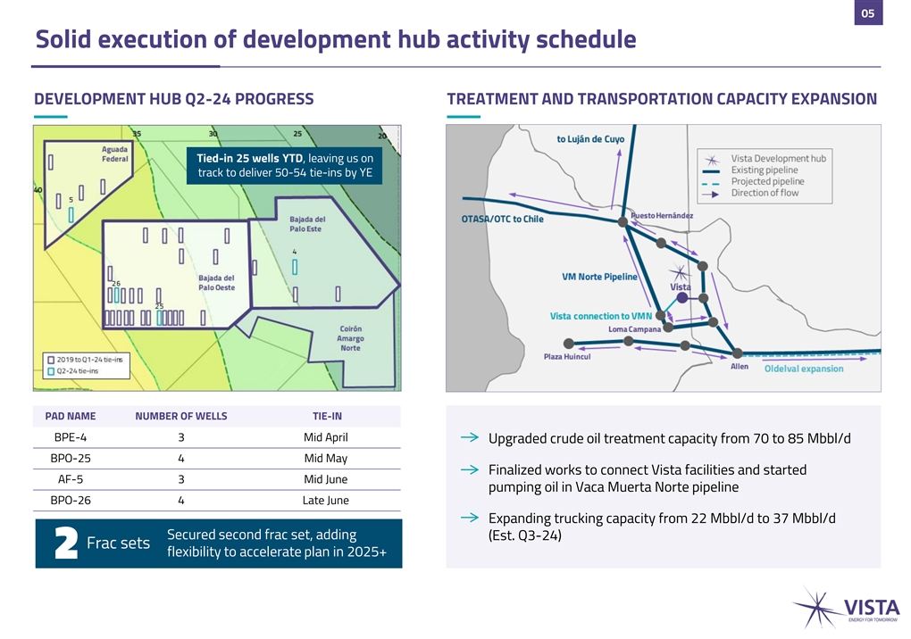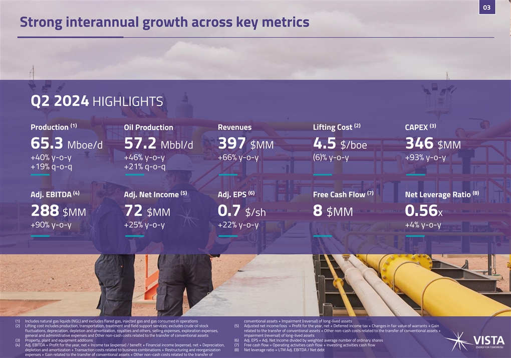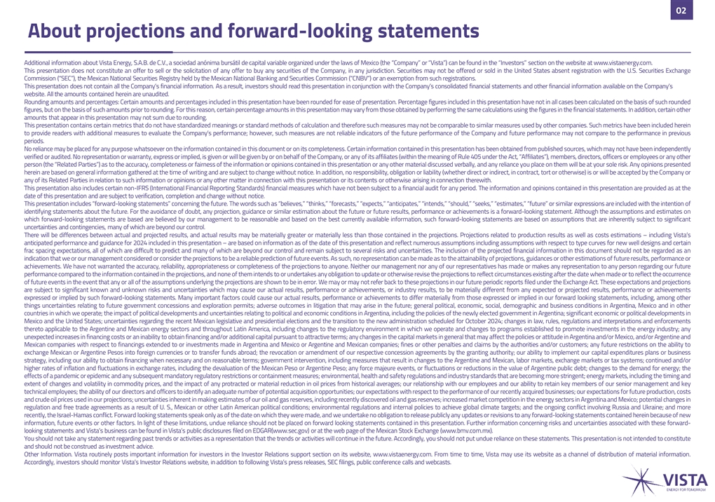 02 About projections and forward-looking statements Additional information about Vista Energy, S.A.B. de C.V., a sociedad anónima bursátil de capital variable organized under the laws of Mexico (the“Company” or“Vista”) can be found in the“Investors” section on the website at www.vistaenergy.com. This presentation does not constitute an offer to sell or the solicitation of any offer to buy any securities of the Company, in any jurisdiction. Securities may not be offered or sold in the United States absent registration with the U.S. Securities Exchange Commission(“SEC”), the Mexican National Securities Registry held by the Mexican National Banking and Securities Commission(“CNBV”) or an exemption from such registrations. This presentation does not contain all theCompany’s financial information. As a result, investors should read this presentation in conjunction with theCompany’s consolidated financial statements and other financial information available on theCompany’s website. All the amounts contained herein are unaudited. Rounding amounts and percentages: Certain amounts and percentages included in this presentation have been rounded for ease of presentation. Percentage figures included in this presentation have not in all cases been calculated on the basis of such rounded figures, but on the basis of such amounts prior to rounding. For this reason, certain percentage amounts in this presentation may vary from those obtained by performing the same calculations using the figures in the financial statements. In addition, certain other amounts that appear in this presentation may not sum due to rounding. This presentation contains certain metrics that do not have standardized meanings or standard methods of calculation and therefore such measures may not be comparable to similar measures used by other companies. Such metrics have been included herein to provide readers with additional measures to evaluate theCompany’s performance; however, such measures are not reliable indicators of the future performance of the Company and future performance may not compare to the performance in previous periods. No reliance may be placed for any purpose whatsoever on the information contained in this document or on its completeness. Certain information contained in this presentation has been obtained from published sources, which may not have been independently verified or audited. No representation or warranty, express or implied, is given or will be given by or on behalf of the Company, or any of its affiliates (within the meaning of Rule 405 under the Act,“Affiliates”), members, directors, officers or employees or any other person (the“RelatedParties”) as to the accuracy, completeness or fairness of the information or opinions contained in this presentation or any other material discussed verbally, and any reliance you place on them will be at your sole risk. Any opinions presented herein are based on general information gathered at the time of writing and are subject to change without notice. In addition, no responsibility, obligation or liability (whether direct or indirect, in contract, tort or otherwise) is or will be accepted by the Company or any of its Related Parties in relation to such information or opinions or any other matter in connection with this presentation or its contents or otherwise arising in connection therewith. This presentation also includes certain non-IFRS (International Financial Reporting Standards) financial measures which have not been subject to a financial audit for any period. The information and opinions contained in this presentation are provided as at the date of this presentation and are subject to verification, completion and change without notice. This presentation includes“forward-lookingstatements” concerning the future. The words such as“believes,”“thinks,”“forecasts,”“expects,”“anticipates,”“intends,”“should,”“seeks,”“estimates,”“future” or similar expressions are included with the intention of identifying statements about the future. For the avoidance of doubt, any projection, guidance or similar estimation about the future or future results, performance or achievements is a forward-looking statement. Although the assumptions and estimates on which forward-looking statements are based are believed by our management to be reasonable and based on the best currently available information, such forward-looking statements are based on assumptions that are inherently subject to significant uncertainties and contingencies, many of which are beyond our control. There will be differences between actual and projected results, and actual results may be materially greater or materially less than those contained in the projections. Projections related to production results as well as costs estimations– includingVista’s anticipated performance and guidance for 2024 included in this presentation– are based on information as of the date of this presentation and reflect numerous assumptions including assumptions with respect to type curves for new well designs and certain frac spacing expectations, all of which are difficult to predict and many of which are beyond our control and remain subject to several risks and uncertainties. The inclusion of the projected financial information in this document should not be regarded as an indication that we or our management considered or consider the projections to be a reliable prediction of future events. As such, no representation can be made as to the attainability of projections, guidances or other estimations of future results, performance or achievements. We have not warranted the accuracy, reliability, appropriateness or completeness of the projections to anyone. Neither our management nor any of our representatives has made or makes any representation to any person regarding our future performance compared to the information contained in 