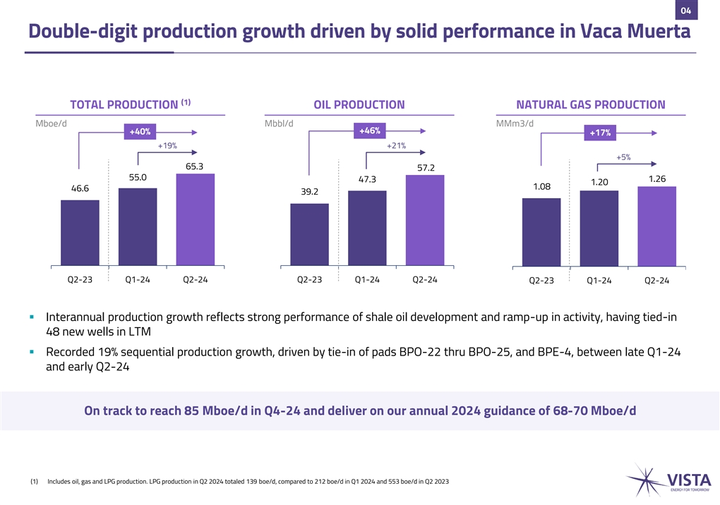 03 Strong interannual growth across key metrics Q2 2024 HIGHLIGHTS (1) (2) (3) Production Revenues Lifting Cost Oil Production CAPEX 65.3 Mboe/d 57.2 Mbbl/d 397 $MM 4.5 $/boe 346 $MM +40% y-o-y +46% y-o-y +66% y-o-y (6)% y-o-y +93% y-o-y +19% q-o-q +21% q-o-q (4) (5) (6) (7) (8) Adj. EBITDA Adj. Net Income Adj. EPS Free Cash Flow Net Leverage Ratio 288 $MM 72 $MM 0.7 $/sh 8 $MM 0.56x +90% y-o-y +25% y-o-y +22% y-o-y +4% y-o-y (1) Includes natural gas liquids (NGL) and excludes flared gas, injected gas and gas consumed in operations conventional assets + Impairment (reversal) of long-lived assets (2) Lifting cost includes production, transportation, treatment and field support services; excludes crude oil stock (5) Adjusted net income/loss = Profit for the year, net + Deferred income tax + Changes in fair value of warrants + Gain fluctuations, depreciation, depletion and amortization, royalties and others, selling expenses, exploration expenses, related to the transfer of conventional assets + Other non-cash costs related to the transfer of conventional assets + general and administrative expenses and Other non-cash costs related to the transfer of conventional assets impairment (reversal) of long-lived assets (3) Property, plant and equipment additions (6) Adj. EPS = Adj. Net Income divided by weighted average number of ordinary shares (4) Adj. EBITDA = Profit for the year, net + Income tax (expense) / benefit + Financial income (expense), net + Depreciation, (7) Free cash flow = Operating activities cash flow + Investing activities cash flow depletion and amortization + Transaction costs related to business combinations + Restructuring and reorganization (8) Net leverage ratio = LTM Adj. EBITDA / Net debt expenses + Gain related to the transfer of conventional assets + Other non-cash costs related to the transfer of