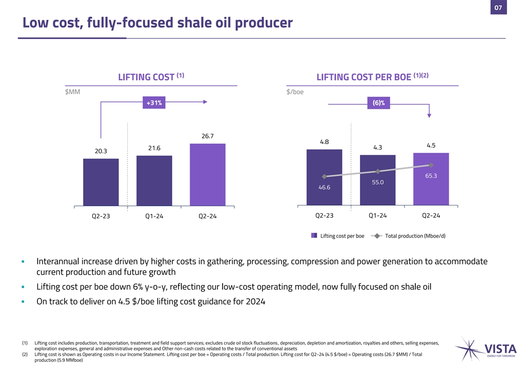 06 Oil production and prices drive solid revenue growth (1) REVENUES AVERAGE CRUDE OIL PRICE AVERAGE NATURAL GAS PRICE $MM $/bbl $/MMBtu +12% +66% +25% 71.8 70.3 396.7 3.9 3.9 64.3 317.4 2.8 239.6 Q2-23 Q1-24 Q2-24 Q2-23 Q1-24 Q2-24 Q2-23 Q1-24 Q2-24 % of export in 49% 41% 40% total revenues Oil exports ▪ Realized oil prices of 73.7 $/bbl in ▪ Exported 14% of total gas 1.6 1.6 1.9 (MMbbl) the domestic market (68.9 $/bbl volumes at 7.7 $/MMBtu (2) net of trucking) and 76.6 $/bbl ▪ Strong increase y-o-y, driven by in the export market 46% boost in oil production and ▪ 64% of oil sales volumes sold at 12% improvement in realized oil export parity prices prices (1) Revenues include export duties: 8.7 $MM in Q2-23, 9.6 $MM Q1-24 and 11.8 $MM Q2-24 (2) Net of export tax. Export price before export tax was 82.8 $/bbl in Q2-24