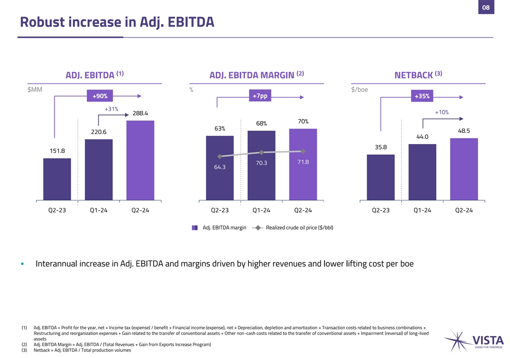 07 Low cost, fully-focused shale oil producer (1) (1)(2) LIFTING COST LIFTING COST PER BOE $MM $/boe +31% (6)% 26.7 4.8 4.5 4.3 21.6 20.3 65.3 55.0 46.6 Q2-23 Q1-24 Q2-24 Q2-23 Q1-24 Q2-24 Lifting cost per boe Total production (Mboe/d) ▪ Interannual increase driven by higher costs in gathering, processing, compression and power generation to accommodate current production and future growth ▪ Lifting cost per boe down 6% y-o-y, reflecting our low-cost operating model, now fully focused on shale oil ▪ On track to deliver on 4.5 $/boe lifting cost guidance for 2024 (1) Lifting cost includes production, transportation, treatment and field support services; excludes crude oil stock fluctuations, depreciation, depletion and amortization, royalties and others, selling expenses, exploration expenses, general and administrative expenses and Other non-cash costs related to the transfer of conventional assets (2) Lifting cost is shown as Operating costs in our Income Statement. Lifting cost per boe = Operating costs / Total production. Lifting cost for Q2-24 (4.5 $/boe) = Operating costs (26.7 $MM) / Total production (5.9 MMboe)