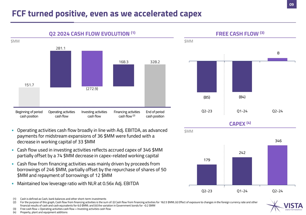 08 Robust increase in Adj. EBITDA (1) (2) (3) ADJ. EBITDA ADJ. EBITDA MARGIN NETBACK $MM % $/boe +7pp +90% +35% p.p. p.p. +31% +10% 288.4 70% 68% 63% 48.5 220.6 44.0 35.8 151.8 71.8 70.3 64.3 Q2-23 Q1-24 Q2-24 Q2-23 Q1-24 Q2-24 Q2-23 Q1-24 Q2-24 Adj. EBITDA margin Realized crude oil price ($/bbl) ▪ Interannual increase in Adj. EBITDA and margins driven by higher revenues and lower lifting cost per boe (1) Adj. EBITDA = Profit for the year, net + Income tax (expense) / benefit + Financial income (expense), net + Depreciation, depletion and amortization + Transaction costs related to business combinations + Restructuring and reorganization expenses + Gain related to the transfer of conventional assets + Other non-cash costs related to the transfer of conventional assets + Impairment (reversal) of long-lived assets (2) Adj. EBITDA Margin = Adj. EBITDA / (Total Revenues + Gain from Exports Increase Program) (3) Netback = Adj. EBITDA / Total production volumes