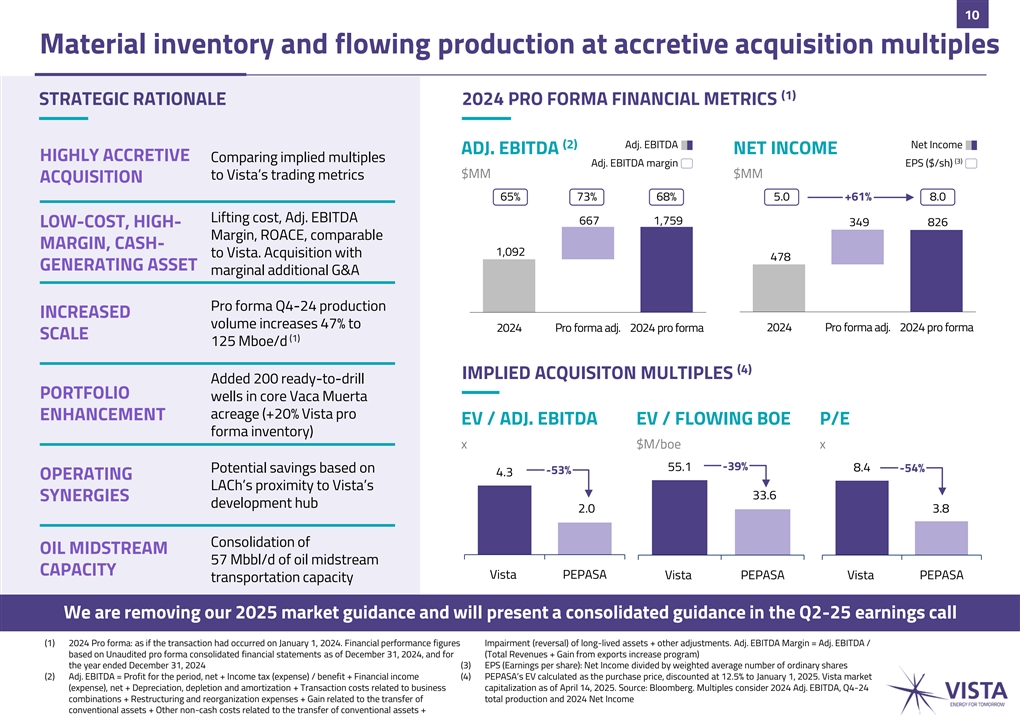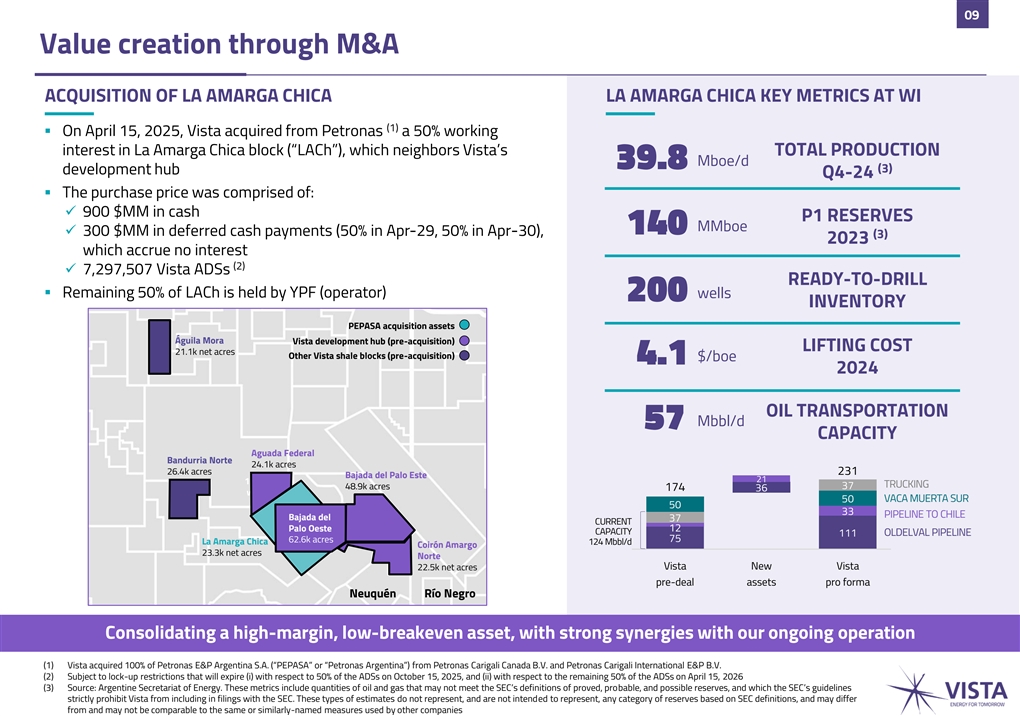 09 Value creation through M&A ACQUISITION OF LA AMARGA CHICA LA AMARGA CHICA KEY METRICS AT WI (1) ▪ On April 15, 2025, Vista acquired from Petronas a 50% working interest in La Amarga Chica block (“LACh”), which neighbors Vista’s TOTAL PRODUCTION Mboe/d 39.8 (3) development hub Q4-24 ▪ The purchase price was comprised of: ✓ 900 $MM in cash P1 RESERVES MMboe 140 ✓ 300 $MM in deferred cash payments (50% in Apr-29, 50% in Apr-30), (3) 2023 which accrue no interest (2) ✓ 7,297,507 Vista ADSs READY-TO-DRILL ▪ Remaining 50% of LACh is held by YPF (operator) wells 200 INVENTORY PEPASA acquisition assets Águila Mora Vista development hub (pre-acquisition) LIFTING COST 21.1k net acres Other Vista shale blocks (pre-acquisition) $/boe 4.1 2024 OIL TRANSPORTATION Mbbl/d 57 CAPACITY Aguada Federal Bandurria Norte 24.1k acres 26.4k acres 231 Bajada del Palo Este 21 150 TRUCKING 48.9k acres 37 174 36 wells VACA MUERTA SUR 50 50 33 PIPELINE TO CHILE Bajada del 37 CURRENT Palo Oeste 12 CAPACITY 111 OLDELVAL PIPELINE 75 62.6k acres La Amarga Chica 124 Mbbl/d Coirón Amargo 23.3k net acres Norte Vista New Vista 22.5k net acres pre-deal assets pro forma Neuquén Río Negro Consolidating a high-margin, low-breakeven asset, with strong synergies with our ongoing operation (1) Vista acquired 100% of Petronas E&P Argentina S.A. (“PEPASA” or “Petronas Argentina”) from Petronas Carigali Canada B.V. and Petronas Carigali International E&P B.V. (2) Subject to lock-up restrictions that will expire (i) with respect to 50% of the ADSs on October 15, 2025, and (ii) with respect to the remaining 50% of the ADSs on April 15, 2026 (3) Source: Argentine Secretariat of Energy. These metrics include quantities of oil and gas that may not meet the SEC’s definitions of proved, probable, and possible reserves, and which the SEC’s guidelines strictly prohibit Vista from including in filings with the SEC. These types of estimates do not represent, and are not intended to represent, any category of reserves based on SEC definitions, and may differ from and may not be comparable to the same or similarly-named measures used by other companies