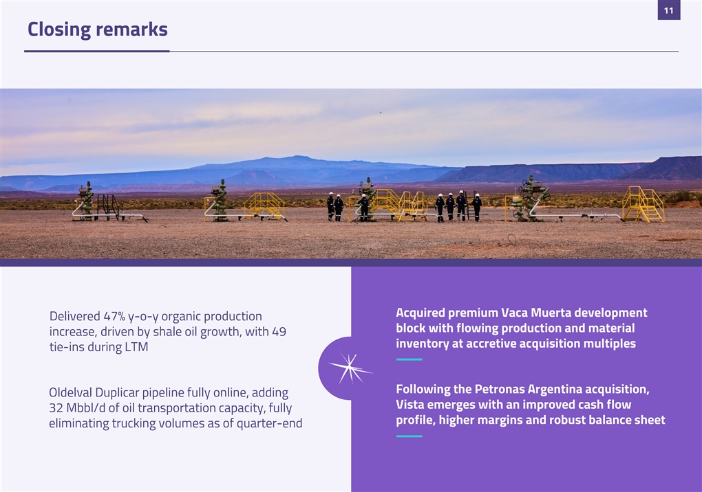 10 Material inventory and flowing production at accretive acquisition multiples (1) STRATEGIC RATIONALE 2024 PRO FORMA FINANCIAL METRICS (2) Adj. EBITDA Net Income ADJ. EBITDA NET INCOME HIGHLY ACCRETIVE Comparing implied multiples (3) Adj. EBITDA margin EPS ($/sh) $MM $MM to Vista’s trading metrics ACQUISITION 65% 73% 68% 5.0 +61% 8.0 1,000 Lifting cost, Adj. EBITDA 667 1,759 349 826 LOW-COST, HIGH- 800 Margin, ROACE, comparable MARGIN, CASH- 1,092 600 to Vista. Acquisition with 478 GENERATING ASSET marginal additional G&A 400 200 Pro forma Q4-24 production - INCREASED volume increases 47% to 2024 Pro forma adj. 2024 pro forma 2024 Pro forma adj. 2024 pro forma SCALE (1) 125 Mboe/d (4) IMPLIED ACQUISITON MULTIPLES Added 200 ready-to-drill PORTFOLIO wells in core Vaca Muerta acreage (+20% Vista pro ENHANCEMENT EV / ADJ. EBITDA EV / FLOWING BOE P/E forma inventory) x $M/boe x 55.1 -39% Potential savings based on 8.4 -54% -53% 4.3 OPERATING LACh’s proximity to Vista’s 33.6 SYNERGIES development hub 2.0 3.8 Consolidation of OIL MIDSTREAM 57 Mbbl/d of oil midstream CAPACITY Vista PEPASA Vista PEPASA Vista PEPASA transportation capacity We are removing our 2025 market guidance and will present a consolidated guidance in the Q2-25 earnings call (1) 2024 Pro forma: as if the transaction had occurred on January 1, 2024. Financial performance figures Impairment (reversal) of long-lived assets + other adjustments. Adj. EBITDA Margin = Adj. EBITDA / based on Unaudited pro forma consolidated financial statements as of December 31, 2024, and for (Total Revenues + Gain from exports increase program) the year ended December 31, 2024 (3) EPS (Earnings per share): Net Income divided by weighted average number of ordinary shares (2) Adj. EBITDA = Profit for the period, net + Income tax (expense) / benefit + Financial income (4) PEPASA’s EV calculated as the purchase price, discounted at 12.5% to January 1, 2025. Vista market (expense), net + Depreciation, depletion and amortization + Transaction costs related to business capitalization as of April 14, 2025. Source: Bloomberg. Multiples consider 2024 Adj. EBITDA, Q4-24 combinations + Restructuring and reorganization expenses + Gain related to the transfer of total production and 2024 Net Income conventional assets + Other non-cash costs related to the transfer of conventional assets +