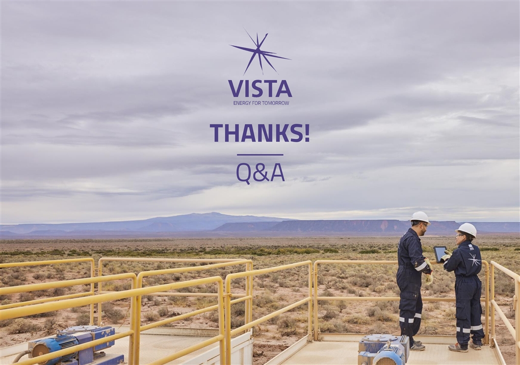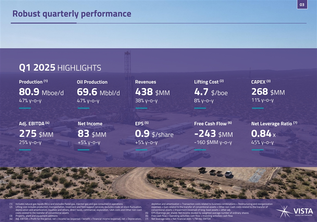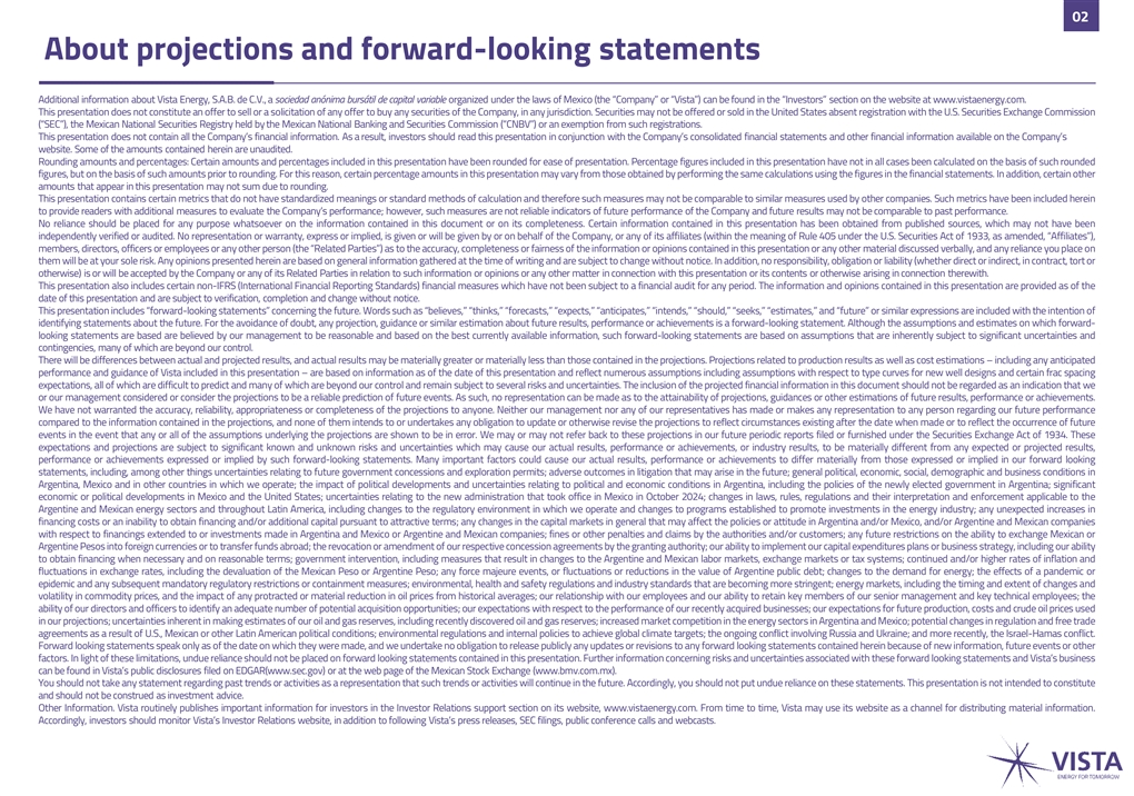 02 About projections and forward-looking statements Additional information about Vista Energy, S.A.B. de C.V., asociedadanónimabursátil decapital variable organized under the laws of Mexico (the “Company” or “Vista”) can be found in the “Investors” section on the website at www.vistaenergy.com. This presentation does not constitute an offer to sell or a solicitation of any offer to buy any securities of the Company, in any jurisdiction. Securities may not be offered or sold in the United States absent registration with the U.S. Securities Exchange Commission (“SEC”), the Mexican National Securities Registry held by the Mexican National Banking and Securities Commission (“CNBV”) or an exemption from such registrations. This presentation does not contain all the Company’s financial information. As a result, investors should read this presentation in conjunction with the Company’s consolidated financial statements and other financial information available on the Company’s website. Some of the amounts contained herein are unaudited. Rounding amounts and percentages: Certain amounts and percentages included in this presentation have been rounded for ease of presentation. Percentage figures included in this presentation have not in all cases been calculated on the basis of such rounded figures, but on the basis of such amounts prior to rounding. For this reason, certain percentage amounts in this presentation may vary from those obtained by performing the same calculations using the figures in the financial statements. In addition, certain other amounts that appear in this presentation may not sum due to rounding. This presentation contains certain metrics that do not have standardized meanings or standard methods of calculation and therefore such measures may not be comparable to similar measures used by other companies. Such metrics have been included herein to provide readers with additional measures to evaluate the Company’s performance; however, such measures are not reliable indicators of future performance of the Company and future results may not be comparable to past performance. No reliance should be placed for any purpose whatsoever on the information contained in this document or on its completeness. Certain information contained in this presentation has been obtained from published sources, which may not have been independently verified or audited. No representation or warranty, express or implied, is given or will be given by or on behalf of the Company, or any of its affiliates (within the meaning of Rule 405 under the U.S. Securities Act of 1933, as amended, “Affiliates”), members, directors, officers or employees or any other person (the “Related Parties”) as to the accuracy, completeness or fairness of the information or opinions contained in this presentation or any other material discussed verbally, and any reliance you place on them will be at your sole risk. Any opinions presented herein are based on general information gathered at the time of writing and are subject to change without notice. In addition, no responsibility, obligation or liability (whether direct or indirect, in contract, tort or otherwise) is or will be accepted by the Company or any of its Related Parties in relation to such information or opinions or any other matter in connection with this presentation or its contents or otherwise arising in connection therewith. This presentation also includes certain non-IFRS (International Financial Reporting Standards) financial measures which have not been subject to a financial audit for any period. The information and opinions contained in this presentation are provided as of the date of this presentation and are subject to verification, completion and change without notice. This presentation includes “forward-looking statements” concerning the future. Words such as “believes,” “thinks,” “forecasts,” “expects,” “anticipates,” “intends,” “should,” “seeks,” “estimates,” and “future” or similar expressions are included with the intention of identifying statements about the future. For the avoidance of doubt, any projection, guidance or similar estimation about future results, performance or achievements is a forward-looking statement. Although the assumptions and estimates on which forward- looking statements are based are believed by our management to be reasonable and based on the best currently available information, such forward-looking statements are based on assumptions that are inherently subject to significant uncertainties and contingencies, many of which are beyond our control. There will be differences between actual and projected results, and actual results may be materially greater or materially less than those contained in the projections. Projections related to production results as well as cost estimations – including any anticipated performance and guidance of Vista included in this presentation – are based on information as of the date of this presentation and reflect numerous assumptions including assumptions with respect to type curves for new well designs and certain frac spacing expectations, all of which are difficult to predict and many of which are beyond our control and remain subject to several risks and uncertainties. The inclusion of the projected financial information in this document should not be regarded as an indication that we or our management considered or consider the projections to be a reliable prediction of future events. As such, no representation can be made as to the attainability of projections, guidances or other estimations of future results, performance or achievements. We have not warranted the accuracy, reliability, appropriateness or completeness of the projections to anyone. Neither our management nor any of our representatives has made or makes any representation to any person regarding our future performance compared to the in