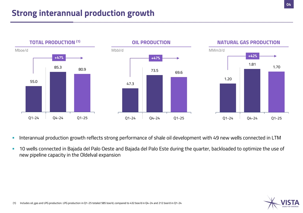 03 Robust quarterly performance Q1 2025 HIGHLIGHTS (1) (2) (3) Production Oil Production Revenues Lifting Cost CAPEX 268 $MM 80.9 Mboe/d 69.6 Mbbl/d 438 $MM 4.7 $/boe 11% y-o-y 47% y-o-y 47% y-o-y 38% y-o-y 8% y-o-y (4) (5) (6) (7) Adj. EBITDA Net Income EPS Free Cash Flow Net Leverage Ratio 275 $MM 83 $MM 0.9 $/share -243 $MM 0.84 x 25% y-o-y +5% y-o-y +5% y-o-y -160 $MM y-o-y 45% y-o-y (1) Includes natural gas liquids (NGL) and excludes flared gas, injected gas and gas consumed in operations depletion and amortization + Transaction costs related to business combinations + Restructuring and reorganization (2) Lifting cost includes production, transportation, treatment and field support services; excludes crude oil stock fluctuation, expenses + Gain related to the transfer of conventional assets + Other non-cash costs related to the transfer of depreciation and amortization, royalties and others, direct taxes, commercial, exploration, G&A costs and Other non-cash conventional assets + Impairment (reversal) of long-lived assets + other adj. costs related to the transfer of conventional assets (5) EPS (Earnings per share): Net Income divided by weighted average number of ordinary shares (3) Property, plant and equipment additions (6) Free cash flow = Operating activities cash flow + Investing activities cash flow (4) Adj. EBITDA = Profit for the period, net + Income tax (expense) / benefit + Financial income (expense), net + Depreciation, (7) Net leverage ratio = Net financial debt / LTM Adj. EBITDA