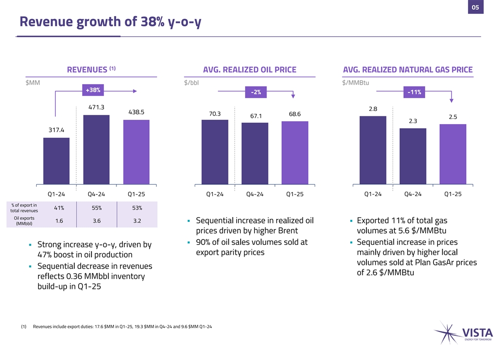 04 Strong interannual production growth (1) TOTAL PRODUCTION OIL PRODUCTION NATURAL GAS PRODUCTION Mboe/d Mbbl/d MMm3/d +42% +47% +47% 1.81 1.70 85.3 80.9 73.5 69.6 1.20 55.0 47.3 Q1-24 Q4-24 Q1-25 Q1-24 Q4-24 Q1-25 Q1-24 Q4-24 Q1-25 ▪ Interannual production growth reflects strong performance of shale oil development with 49 new wells connected in LTM ▪ 10 wells connected in Bajada del Palo Oeste and Bajada del Palo Este during the quarter, backloaded to optimize the use of new pipeline capacity in the Oldelval expansion (1) Includes oil, gas and LPG production. LPG production in Q1-25 totaled 585 boe/d, compared to 432 boe/d in Q4-24 and 212 boe/d in Q1-24