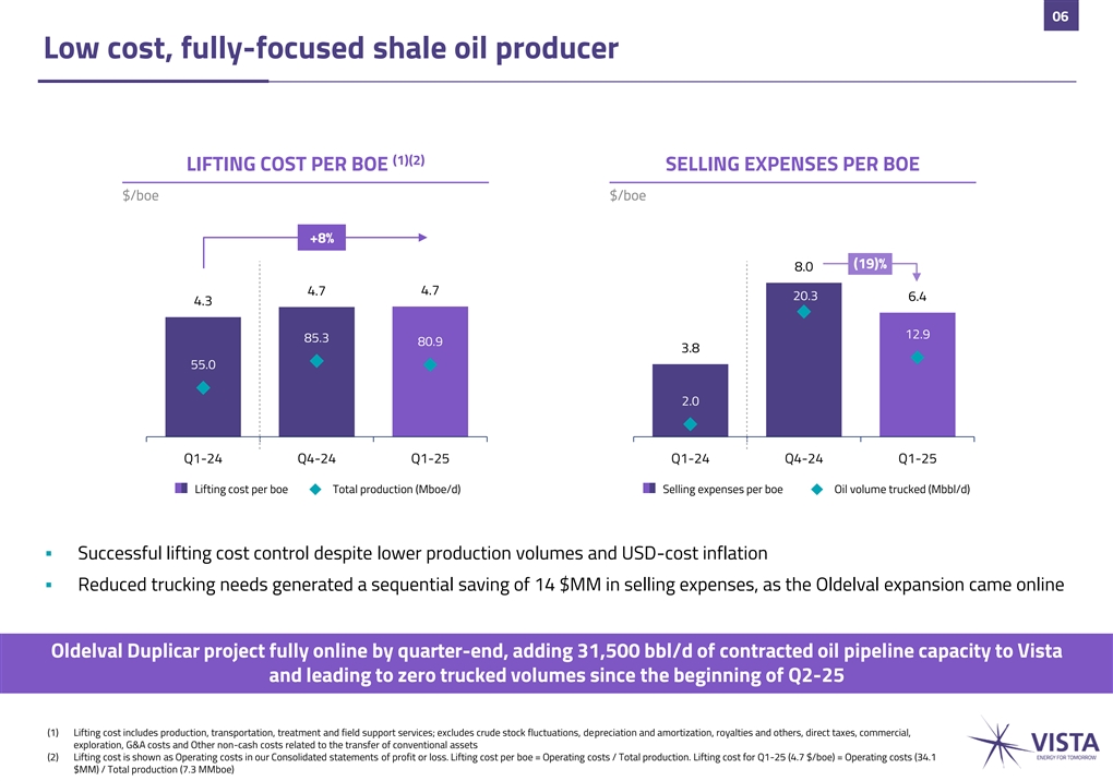 05 Revenue growth of 38% y-o-y (1) REVENUES AVG. REALIZED OIL PRICE AVG. REALIZED NATURAL GAS PRICE $MM $/bbl $/MMBtu +38% -2% -11% 471.3 2.8 438.5 70.3 68.6 67.1 2.5 2.3 317.4 Q1-24 Q4-24 Q1-25 Q1-24 Q4-24 Q1-25 Q1-24 Q4-24 Q1-25 % of export in 41% 55% 53% total revenues Oil exports 1.6 3.6 3.2▪ Sequential increase in realized oil ▪ Exported 11% of total gas (MMbbl) prices driven by higher Brent volumes at 5.6 $/MMBtu ▪ 90% of oil sales volumes sold at ▪ Sequential increase in prices ▪ Strong increase y-o-y, driven by export parity prices mainly driven by higher local 47% boost in oil production volumes sold at Plan GasAr prices ▪ Sequential decrease in revenues of 2.6 $/MMBtu reflects 0.36 MMbbl inventory build-up in Q1-25 (1) Revenues include export duties: 17.6 $MM in Q1-25, 19.3 $MM in Q4-24 and 9.6 $MM Q1-24