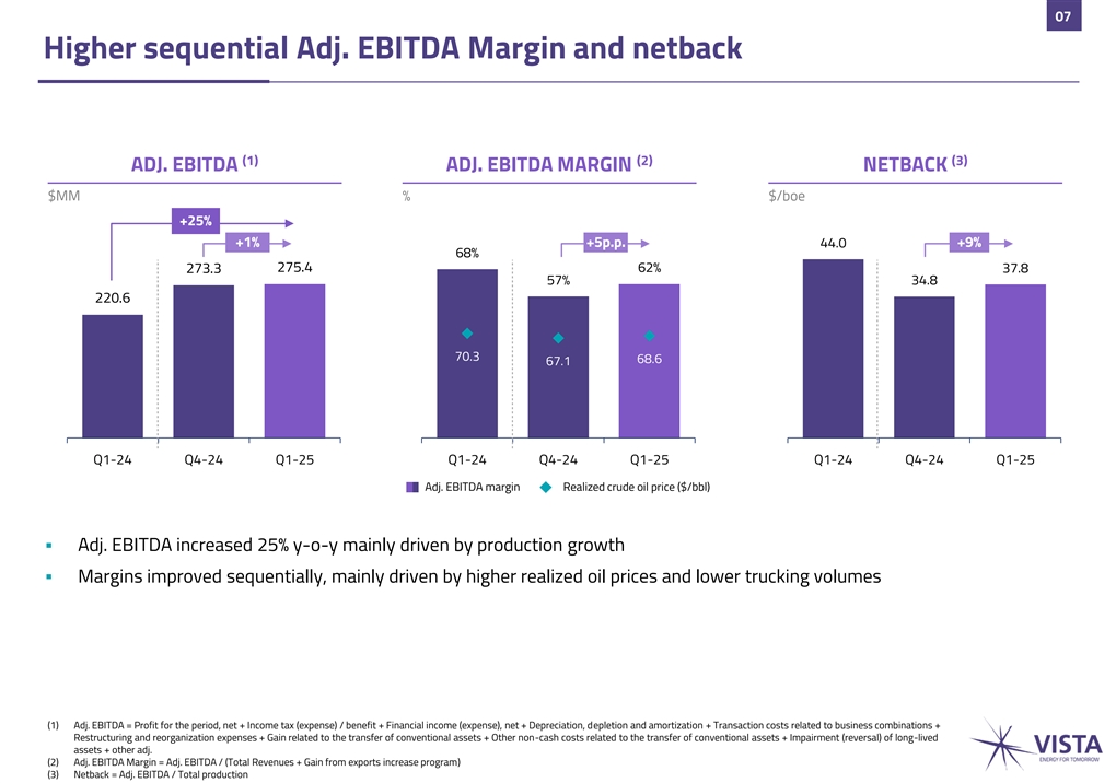 06 Low cost, fully-focused shale oil producer (1)(2) LIFTING COST PER BOE SELLING EXPENSES PER BOE $/boe $/boe +8% (19)% 8.0 4.7 4.7 20.3 6.4 4.3 12.9 85.3 80.9 3.8 55.0 2.0 Q1-24 Q4-24 Q1-25 Q1-24 Q4-24 Q1-25 Lifting cost per boe Total production (Mboe/d) Selling expenses per boe Oil volume trucked (Mbbl/d) ▪ Successful lifting cost control despite lower production volumes and USD-cost inflation ▪ Reduced trucking needs generated a sequential saving of 14 $MM in selling expenses, as the Oldelval expansion came online Oldelval Duplicar project fully online by quarter-end, adding 31,500 bbl/d of contracted oil pipeline capacity to Vista and leading to zero trucked volumes since the beginning of Q2-25 (1) Lifting cost includes production, transportation, treatment and field support services; excludes crude stock fluctuations, depreciation and amortization, royalties and others, direct taxes, commercial, exploration, G&A costs and Other non-cash costs related to the transfer of conventional assets (2) Lifting cost is shown as Operating costs in our Consolidated statements of profit or loss. Lifting cost per boe = Operating costs / Total production. Lifting cost for Q1-25 (4.7 $/boe) = Operating costs (34.1 $MM) / Total production (7.3 MMboe)