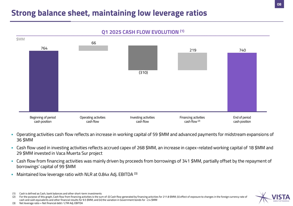 07 Higher sequential Adj. EBITDA Margin and netback (1) (2) (3) ADJ. EBITDA ADJ. EBITDA MARGIN NETBACK $MM % $/boe +25% +1% +5p.p. 44.0 +9% 68% 275.4 62% 273.3 37.8 57% 34.8 220.6 70.3 68.6 67.1 Q1-24 Q4-24 Q1-25 Q1-24 Q4-24 Q1-25 Q1-24 Q4-24 Q1-25 Adj. EBITDA margin Realized crude oil price ($/bbl) ▪ Adj. EBITDA increased 25% y-o-y mainly driven by production growth ▪ Margins improved sequentially, mainly driven by higher realized oil prices and lower trucking volumes (1) Adj. EBITDA = Profit for the period, net + Income tax (expense) / benefit + Financial income (expense), net + Depreciation, depletion and amortization + Transaction costs related to business combinations + Restructuring and reorganization expenses + Gain related to the transfer of conventional assets + Other non-cash costs related to the transfer of conventional assets + Impairment (reversal) of long-lived assets + other adj. (2) Adj. EBITDA Margin = Adj. EBITDA / (Total Revenues + Gain from exports increase program) (3) Netback = Adj. EBITDA / Total production