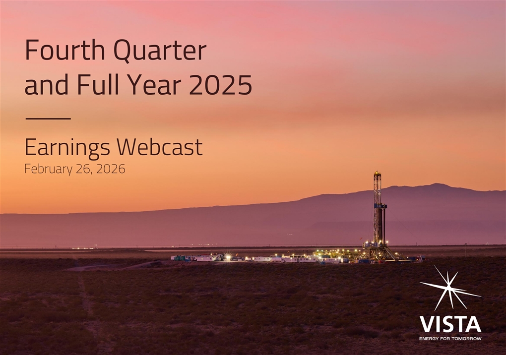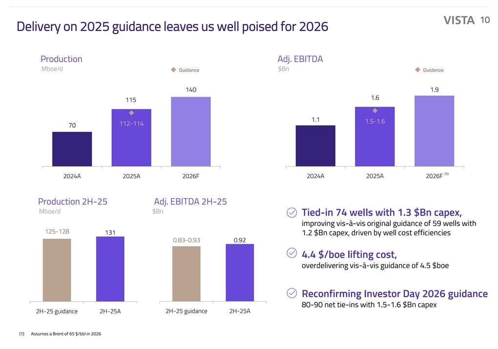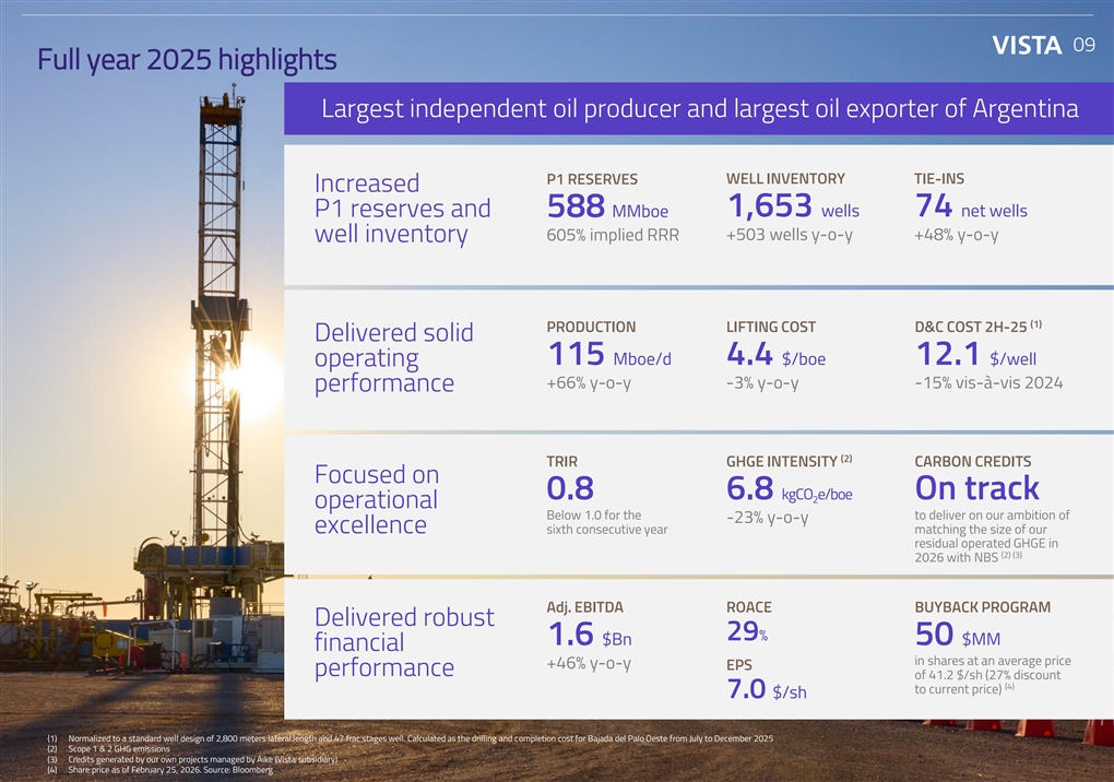 09 Full year 2025 highlights Largest independent oil producer and largest oil exporter of Argentina P1 RESERVES WELL INVENTORY TIE-INS Increased P1 reserves and 1,653 wells 74 net wells 588 MMboe +503 wells y-o-y +48% y-o-y 605% implied RRR well inventory (1) PRODUCTION LIFTING COST D&C COST 2H-25 Delivered solid 115 Mboe/d 4.4 $/boe 12.1 $/well operating +66% y-o-y -3% y-o-y -15% vis-à-vis 2024 performance (2) TRIR GHGE INTENSITY CARBON CREDITS Focused on 0.8 6.8 kgCO e/boe On track 2 operational Below 1.0 for the to deliver on our ambition of -23% y-o-y excellence sixth consecutive year matching the size of our residual operated GHGE in (2) (3) 2026 with NBS Adj. EBITDA ROACE BUYBACK PROGRAM Delivered robust 29% 1.6 $Bn 50 $MM financial in shares at an average price +46% y-o-y EPS performance of 41.2 $/sh (27% discount (4) to current price) 7.0 $/sh (1) Normalized to a standard well design of 2,800 meters lateral length and 47 frac stages well. Calculated as the drilling and completion cost for Bajada del Palo Oeste from July to December 2025 (2) Scope 1 & 2 GHG emissions (3) Credits generated by our own projects managed by Aike (Vista subsidiary) (4) Share price as of February 25, 2026. Source: Bloomberg