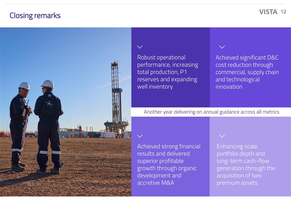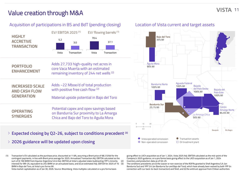 11 Value creation through M&A Acquisition of participations in BS and BdT (pending closing) Location of Vista current and target assets (1) (1) EV/ EBITDA 2025 EV/ flowing barrels HIGHLY 70.4 5.2 ACCRETIVE 37.1 3.0 TRANSACTION Vista Transaction Vista Transaction Bajo del Toro 17.4k acres Adds 27,733 high-quality net acres in PORTFOLIO core Vaca Muerta with an estimated ENHANCEMENT (2) remaining inventory of 244 net wells Águila Mora Adds ~22 Mboe/d of total production INCREASED SCALE (2) with positive free cash flow AND CASH FLOW GENERATION Material upside potential in Bajo del Toro Aguada Federal Potential capex and opex savings based Bandurria Norte Bajada OPERATING del Palo Oeste on Bandurria Sur proximity to La Amarga Bajada del SYNERGIES Chica and Bajo del Toro to Aguila Mora Palo Este Coirón Amargo (3) Expected closing by Q2-26, subject to conditions precedent Norte La Amarga Bandurria Sur Chica 14.2k acres 2026 guidance will be updated upon closing (1) Transaction’s EV calculated as the purchase price, discounted at 11.8%, assuming a Brent price of 68.2 $/bbl for the giving effect to LACh acquisition as of Jan 1, 2024. Vista 2025 Adj. EBITDA calculated as the mid-point of the contingent payments, in line with Brent price average for 2025. Annualized Transaction Adj. EBITDA calculated as the Company’s 2025 guidance, on a pro forma basis giving effect to the LACh acquisition as of Jan 1, 2024 sum of (i) 190 $MM from Equinor Argentina S.A.U Adj. EBITDA at Vista’s adjusted stake (subtracting YPF’s minority (2) Inventory and production data as of Q3-25 interest) for 9M-25, equivalent to 254 $MM on an annualized basis, and (ii) an estimated Adj. EBITDA for 2025 of 15 (3) The conditions precedents are (i) the waiver or non-exercise of the ROFRs granted to Shell Argentina S.A. (on $MM in Bajo del Toro, at Vista’s pro forma WI. Bandurria Sur) and YPF S.A. (on Bandurria Sur and Bajo del Toro), which have already been waived by both YPF (in Vista market capitalization as of Jan 30, 2026. Source: Bloomberg. Vista multiples calculated on a pro forma basis connection with our back-to-back transaction) and Shell, and (ii) the antitrust approval from Chilean authorities
