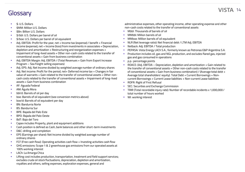 14 Glossary ▪ $: U.S. Dollars administrative expenses, other operating income, other operating expense and other non-cash costs related to the transfer of conventional assets ▪ $MM: Million U.S. Dollars ▪ Mbbl: Thousands of barrels of oil ▪ $Bn: Billion U.S. Dollars ▪ MMbbl: Million barrels of oil ▪ $/bbl: U.S. Dollars per barrel of oil ▪ MMboe: Million barrels of oil equivalent ▪ $/boe: U.S. Dollars per barrel of oil equivalent ▪ NLR (Net leverage ratio): Net financial debt / LTM Adj. EBITDA ▪ Adj. EBITDA: Profit for the year, net + Income tax (expense) / benefit + Financial income (expense), net + Income (loss) from investments in associates + Depreciation, ▪ Netback: Adj. EBITDA / Total production depletion and amortization + Restructuring and reorganization expenses + ▪ PEPASA: Vista Energy LACh S.A., formerly known as Petronas E&P Argentina S.A. Impairment of long-lived assets + Other non-cash costs related to the transfer of ▪ Production includes oil, gas and NGL production, and excludes flared gas, injected conventional assets + Gain from business combination gas and gas consumed in operations ▪ Adj. EBITDA Margin: Adj. EBITDA / (Total Revenues + Gain from Export Increase ▪ p.p.: percentage points Program – Sea freight selling expenses) ▪ ROACE: (Adj. EBITDA – Depreciation, depletion and amortization + Gain related to ▪ Adj. EPS: Adj. Net Income divided by weighted average number of ordinary shares the transfer of conventional assets + Other non-cash costs related to the transfer ▪ Adj. Net income: Profit for the period, net+ Deferred income tax + Changes in fair of conventional assets + Gain from business combination) / (Average total debt + value of warrants + Gain related to the transfer of conventional assets + Other non- Average total shareholders’ equity). Total Debt = Current Borrowings + Non- cash costs related to the transfer of conventional assets + Impairment of long-lived current Borrowings + Current Lease liabilities + Non-current Lease liabilities assets + Gain from business combination ▪ ROFR: Right of First Refusal ▪ AF: Aguada Federal ▪ SEC: Securities and Exchange Commission ▪ AM: Águila Mora ▪ TRIR (Total recordable injury rate): Number of recordable incidents x 1,000,000 / ▪ bbl/d: Barrels of oil per day total number of hours worked ▪ boe: Barrels of oil equivalent (see conversion metrics above) ▪ WI: working interest ▪ boe/d: Barrels of oil equivalent per day ▪ BN: Bandurria Norte ▪ BS: Bandurria Sur ▪ BPE: Bajada del Palo Este ▪ BPO: Bajada del Palo Oeste ▪ BdT: Bajo del Toro ▪ Capex includes Property, plant and equipment additions ▪ Cash position is defined as Cash, bank balances and other short-term investments ▪ D&C: drilling and completion ▪ EPS (Earnings per share): Net Income divided by weighted average number of ordinary shares ▪ FCF (Free cash flow): Operating activities cash flow + Investing activities cash flow ▪ GHG emissions: Scope 1 & 2 greenhouse gas emissions from our operated assets at 100% working interest ▪ LACh: La Amarga Chica ▪ Lifting cost includes production, transportation, treatment and field support services; excludes crude oil stock fluctuations, depreciation, depletion and amortization, royalties and others, selling expenses, exploration expenses, general and