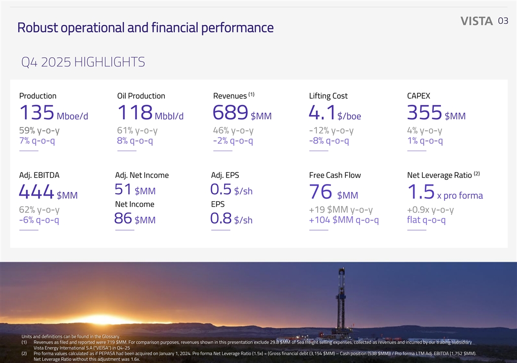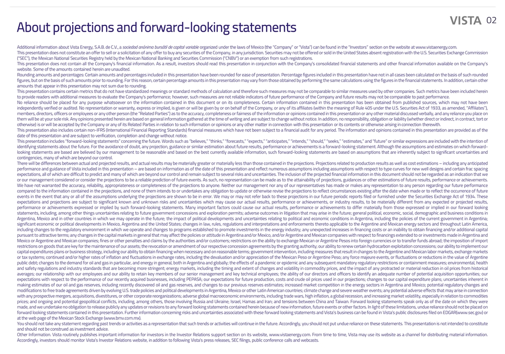 02 About projections and forward-looking statements Additional information about Vista Energy, S.A.B. de C.V., asociedadanónimabursátil decapital variable organized under the laws of Mexico (the “Company” or “Vista”) can be found in the “Investors” section on the website at www.vistaenergy.com. This presentation does not constitute an offer to sell or a solicitation of any offer to buy any securities of the Company, in any jurisdiction. Securities may not be offered or sold in the United States absent registration with the U.S. Securities Exchange Commission (“SEC”), the Mexican National Securities Registry held by the Mexican National Banking and Securities Commission (“CNBV”) or an exemption from such registrations. This presentation does not contain all the Company’s financial information. As a result, investors should read this presentation in conjunction with the Company’s consolidated financial statements and other financial information available on the Company’s website. Some of the amounts contained herein are unaudited. Rounding amounts and percentages: Certain amounts and percentages included in this presentation have been rounded for ease of presentation. Percentage figures included in this presentation have not in all cases been calculated on the basis of such rounded figures, but on the basis of such amounts prior to rounding. For this reason, certain percentage amounts in this presentation may vary from those obtained by performing the same calculations using the figures in the financial statements. In addition, certain other amounts that appear in this presentation may not sum due to rounding. This presentation contains certain metrics that do not have standardized meanings or standard methods of calculation and therefore such measures may not be comparable to similar measures used by other companies. Such metrics have been included herein to provide readers with additional measures to evaluate the Company’s performance; however, such measures are not reliable indicators of future performance of the Company and future results may not be comparable to past performance. No reliance should be placed for any purpose whatsoever on the information contained in this document or on its completeness. Certain information contained in this presentation has been obtained from published sources, which may not have been independently verified or audited. No representation or warranty, express or implied, is given or will be given by or on behalf of the Company, or any of its affiliates (within the meaning of Rule 405 under the U.S. Securities Act of 1933, as amended, “Affiliates”), members, directors, officers or employees or any other person (the “Related Parties”) as to the accuracy, completeness or fairness of the information or opinions contained in this presentation or any other material discussed verbally, and any reliance you place on them will be at your sole risk. Any opinions presented herein are based on general information gathered at the time of writing and are subject to change without notice. In addition, no responsibility, obligation or liability (whether direct or indirect, in contract, tort or otherwise) is or will be accepted by the Company or any of its Related Parties in relation to such information or opinions or any other matter in connection with this presentation or its contents or otherwise arising in connection therewith. This presentation also includes certain non-IFRS (International Financial Reporting Standards) financial measures which have not been subject to a financial audit for any period. The information and opinions contained in this presentation are provided as of the date of this presentation and are subject to verification, completion and change without notice. This presentation includes “forward-looking statements” concerning the future. Words such as “believes,” “thinks,” “forecasts,” “expects,” “anticipates,” “intends,” “should,” “seeks,” “estimates,” and “future” or similar expressions are included with the intention of identifying statements about the future. For the avoidance of doubt, any projection, guidance or similar estimation about future results, performance or achievements is a forward-looking statement. Although the assumptions and estimates on which forward- looking statements are based are believed by our management to be reasonable and based on the best currently available information, such forward-looking statements are based on assumptions that are inherently subject to significant uncertainties and contingencies, many of which are beyond our control. There will be differences between actual and projected results, and actual results may be materially greater or materially less than those contained in the projections. Projections related to production results as well as cost estimations – including any anticipated performance and guidance of Vista included in this presentation – are based on information as of the date of this presentation and reflect numerous assumptions including assumptions with respect to type curves for new well designs and certain frac spacing expectations, all of which are difficult to predict and many of which are beyond our control and remain subject to several risks and uncertainties. The inclusion of the projected financial information in this document should not be regarded as an indication that we or our management considered or consider the projections to be a reliable prediction of future events. As such, no representation can be made as to the attainability of projections, guidances or other estimations of future results, performance or achievements. We have not warranted the accuracy, reliability, appropriateness or completeness of the projections to anyone. Neither our management nor any of our representatives has made or makes any representation to any person regarding our future performance compared to the in