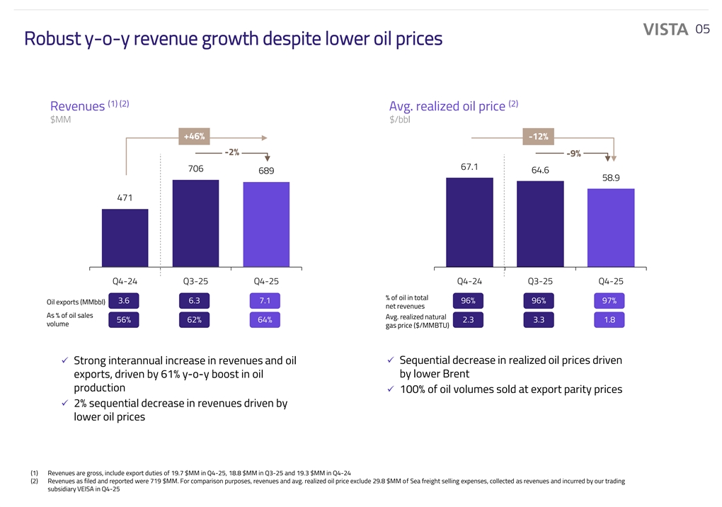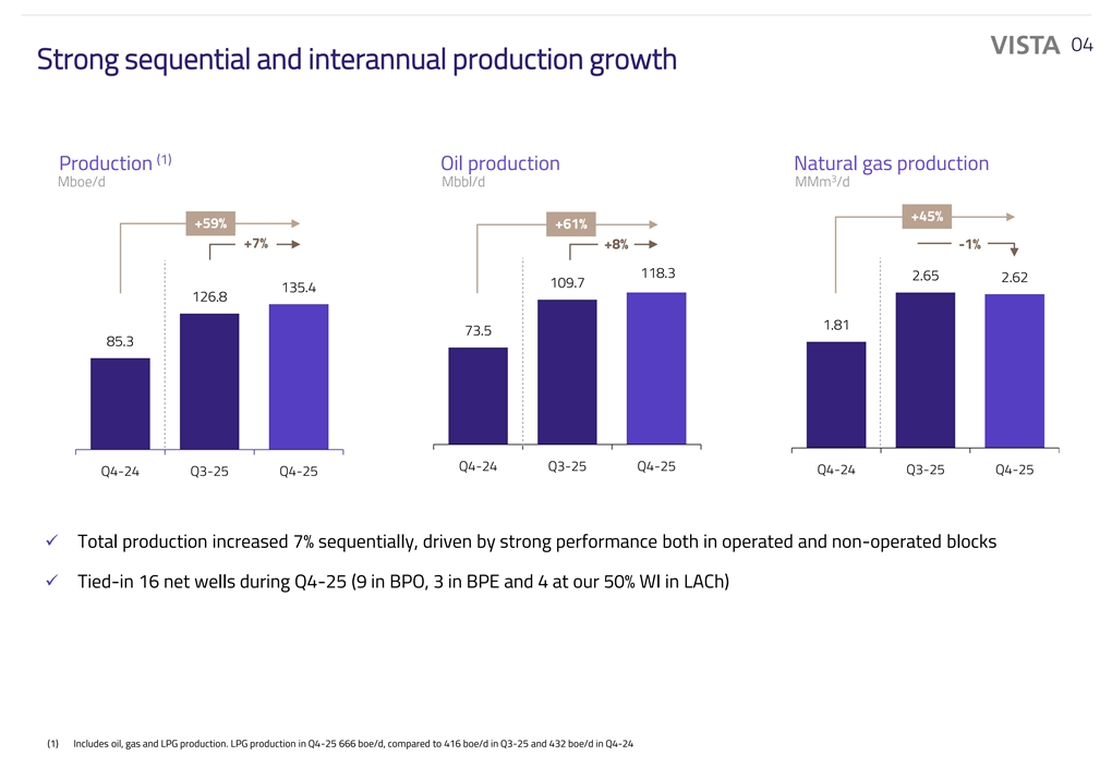 03 Robust operational and financial performance Q4 2025 HIGHLIGHTS (1) Production Oil Production Revenues Lifting Cost CAPEX 135 Mboe/d 118 Mbbl/d 689 $MM 4.1$/boe 355 $MM 59% y-o-y 61% y-o-y 46% y-o-y -12% y-o-y 4% y-o-y 7% q-o-q 8% q-o-q -2% q-o-q -8% q-o-q 1% q-o-q (2) Adj. EBITDA Adj. Net Income Adj. EPS Free Cash Flow Net Leverage Ratio 51 $MM 0.5 $/sh 444 $MM 76 $MM 1.5 x pro forma Net Income EPS 62% y-o-y +19 $MM y-o-y +0.9x y-o-y -6% q-o-q 86 $MM 0.8 $/sh +104 $MM q-o-q flat q-o-q Units and definitions can be found in the Glossary. (1) Revenues as filed and reported were 719 $MM. For comparison purposes, revenues shown in this presentation exclude 29.8 $MM of Sea freight selling expenses, collected as revenues and incurred by our trading subsidiary Vista Energy International S.A (“VEISA”) in Q4-25 (2) Pro forma values calculated as if PEPASA had been acquired on January 1, 2024. Pro forma Net Leverage Ratio (1.5x) = (Gross financial debt (3,154 $MM) – Cash position (538 $MM)) / Pro forma LTM Adj. EBITDA (1,752 $MM). Net Leverage Ratio without this adjustment was 1.6x.