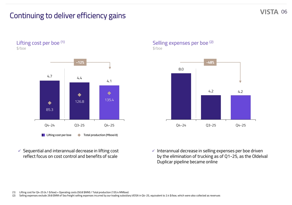 05 Robust y-o-y revenue growth despite lower oil prices (1) (2) (2) Revenues Avg. realized oil price $MM $/bbl +46% -12% -2% -9% 67.1 706 64.6 689 58.9 471 Q4-24 Q3-25 Q4-25 Q4-24 Q3-25 Q4-25 % of oil in total 3.6 6.3 7.1 96% 96% 97% Oil exports (MMbbl) net revenues As % of oil sales Avg. realized natural 56% 62% 64% 2.3 3.3 1.8 volume gas price ($/MMBTU) ✓ Sequential decrease in realized oil prices driven ✓ Strong interannual increase in revenues and oil exports, driven by 61% y-o-y boost in oil by lower Brent production ✓ 100% of oil volumes sold at export parity prices ✓ 2% sequential decrease in revenues driven by lower oil prices (1) Revenues are gross, include export duties of 19.7 $MM in Q4-25, 18.8 $MM in Q3-25 and 19.3 $MM in Q4-24 (2) Revenues as filed and reported were 719 $MM. For comparison purposes, revenues and avg. realized oil price exclude 29.8 $MM of Sea freight selling expenses, collected as revenues and incurred by our trading subsidiary VEISA in Q4-25