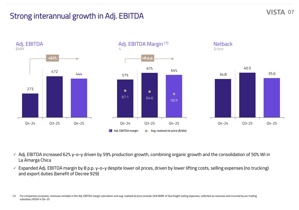 06 Continuing to deliver efficiency gains (1) (2) Lifting cost per boe Selling expenses per boe $/boe $/boe -12% -48% 8.0 4.7 4.4 4.1 4.2 4.2 135.4 126.8 85.3 Q4-24 Q3-25 Q4-25 Q4-24 Q3-25 Q4-25 Lifting cost per boe Total production (Mboe/d) ✓ Sequential and interannual decrease in lifting cost ✓ Interannual decrease in selling expenses per boe driven reflect focus on cost control and benefits of scale by the elimination of trucking as of Q1-25, as the Oldelval Duplicar pipeline became online (1) Lifting cost for Q4-25 (4.1 $/boe) = Operating costs (50.8 $MM) / Total production (135.4 MMboe) (2) Selling expenses exclude 29.8 $MM of Sea freight selling expenses incurred by our trading subsidiary VEISA in Q4-25, equivalent to 2.4 $/boe, which were also collected as revenues