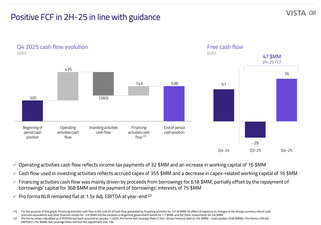 07 Strong interannual growth in Adj. EBITDA (1) Adj. EBITDA Adj. EBITDA Margin Netback $MM % $/boe +62% +8 p.p. 40.5 67% 64% 472 35.6 444 34.8 57% 273 67.1 64.6 58.9 Q4-24 Q3-25 Q4-25 Q4-24 Q3-25 Q4-25 Q4-24 Q3-25 Q4-25 Adj. EBITDA margin Avg. realized oil price ($/bbl) ✓ Adj. EBITDA increased 62% y-o-y driven by 59% production growth, combining organic growth and the consolidation of 50% WI in La Amarga Chica ✓ Expanded Adj. EBITDA margin by 8 p.p. y-o-y despite lower oil prices, driven by lower lifting costs, selling expenses (no trucking) and export duties (benefit of Decree 929) (1) For comparison purposes, revenues included in the Adj. EBITDA margin calculation and avg. realized oil price exclude 29.8 $MM of Sea freight selling expenses, collected as revenues and incurred by our trading subsidiary VEISA in Q4-25