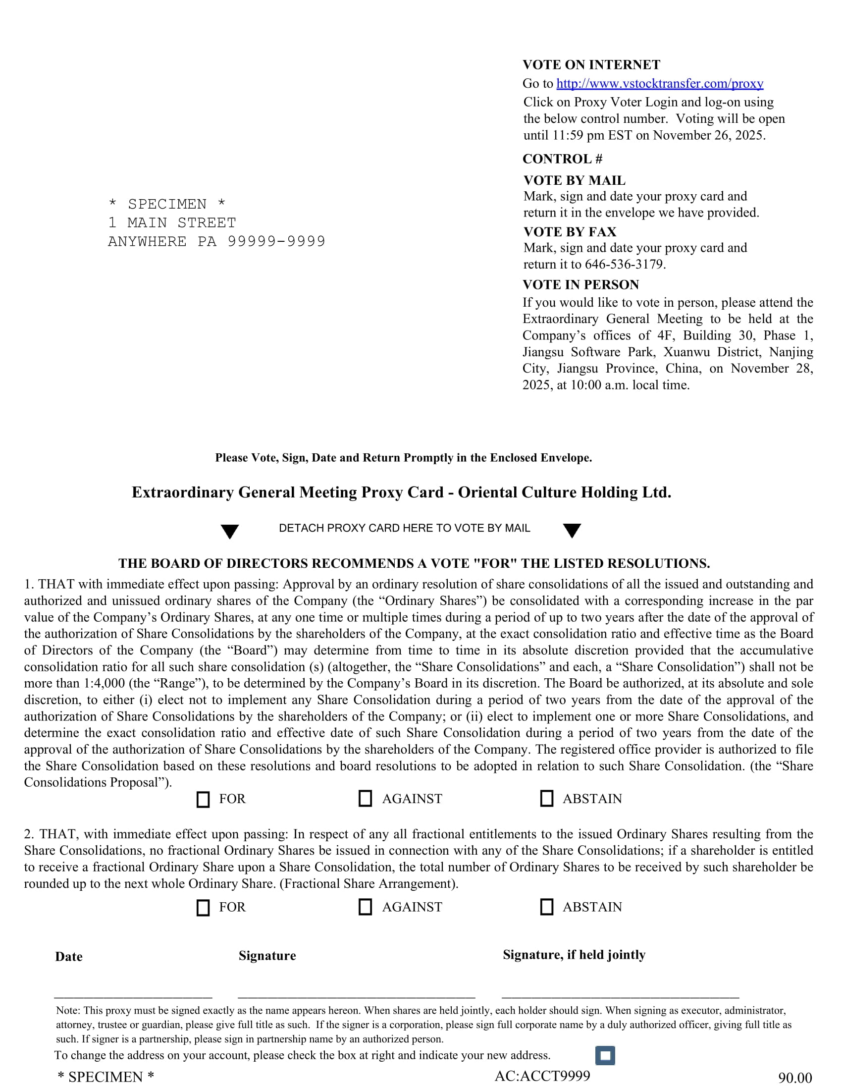 VOTE ON INTERNET Go to http://www.vstocktransfer.com/proxy Click on Proxy Voter Login and log - on using the below control number. Voting will be open until 11:59 pm EST on November 26, 2025. CONTROL # VOTE BY MAIL Mark, sign and date your proxy card and return it in the envelope we have provided . VOTE BY FAX Mark, sign and date your proxy card and return it to 646 - 536 - 3179. VOTE IN PERSON If you would like to vote in person, please attend the Extraordinary General Meeting to be held at the Company’s offices of 4 F, Building 30 , Phase 1 , Jiangsu Software Park, Xuanwu District, Nanjing City, Jiangsu Province, China, on November 28 , 2025 , at 10 : 00 a . m . local time . * SPECIMEN * 1 MAIN STREET ANYWHERE PA 99999 - 9999 Please Vote, Sign, Date and Return Promptly in the Enclosed Envelope. Extraordinary General Meeting Proxy Card - Oriental Culture Holding Ltd. DETACH PROXY CARD HERE TO VOTE BY MAIL THE BOARD OF DIRECTORS RECOMMENDS A VOTE "FOR" THE LISTED RESOLUTIONS. 1. THAT with immediate effect upon passing : Approval by an ordinary resolution of share consolidations of all the issued and outstanding and authorized and unissued ordinary shares of the Company (the “Ordinary Shares”) be consolidated with a corresponding increase in the par value of the Company’s Ordinary Shares, at any one time or multiple times during a period of up to two years after the date of the approval of the authorization of Share Consolidations by the shareholders of the Company, at the exact consolidation ratio and effective time as the Board of Directors of the Company (the “Board”) may determine from time to time in its absolute discretion provided that the accumulative consolidation ratio for all such share consolidation (s) (altogether, the “Share Consolidations” and each, a “Share Consolidation”) shall not be more than 1 : 4 , 000 (the “Range”), to be determined by the Company’s Board in its discretion . The Board be authorized, at its absolute and sole discretion, to either (i) elect not to implement any Share Consolidation during a period of two years from the date of the approval of the authorization of Share Consolidations by the shareholders of the Company ; or (ii) elect to implement one or more Share Consolidations, and determine the exact consolidation ratio and effective date of such Share Consolidation during a period of two years from the date of the approval of the authorization of Share Consolidations by the shareholders of the Company . The registered office provider is authorized to file the Share Consolidation based on these resolutions and board resolutions to be adopted in relation to such Share Consolidation . (the “Share Consolidations Proposal”) . FOR AGAINST ABSTAIN 2. THAT, with immediate effect upon passing : In respect of any all fractional entitlements to the issued Ordinary Shares resulting from the Share Consolidations, no fractional Ordinary Shares be issued in connection with any of the Share Consolidations ; if a shareholder is entitled to receive a fractional Ordinary Share upon a Share Consolidation, the total number of Ordinary Shares to be received by such shareholder be rounded up to the next whole Ordinary Share . (Fractional Share Arrangement) . FOR AGAINST ABSTAIN Signature, if held jointly Signature Date Note: This proxy must be signed exactly as the name appears hereon. When shares are held jointly, each holder should sign. When signing as executor, administrator, attorney, trustee or guardian, please give full title as such. If the signer is a corporation, please sign full corporate name by a duly authorized officer, giving full title as such. If signer is a partnership, please sign in partnership name by an authorized person. To change the address on your account, please check the box at right and indicate your new address. * SPECIMEN * AC:ACCT9999 90.00