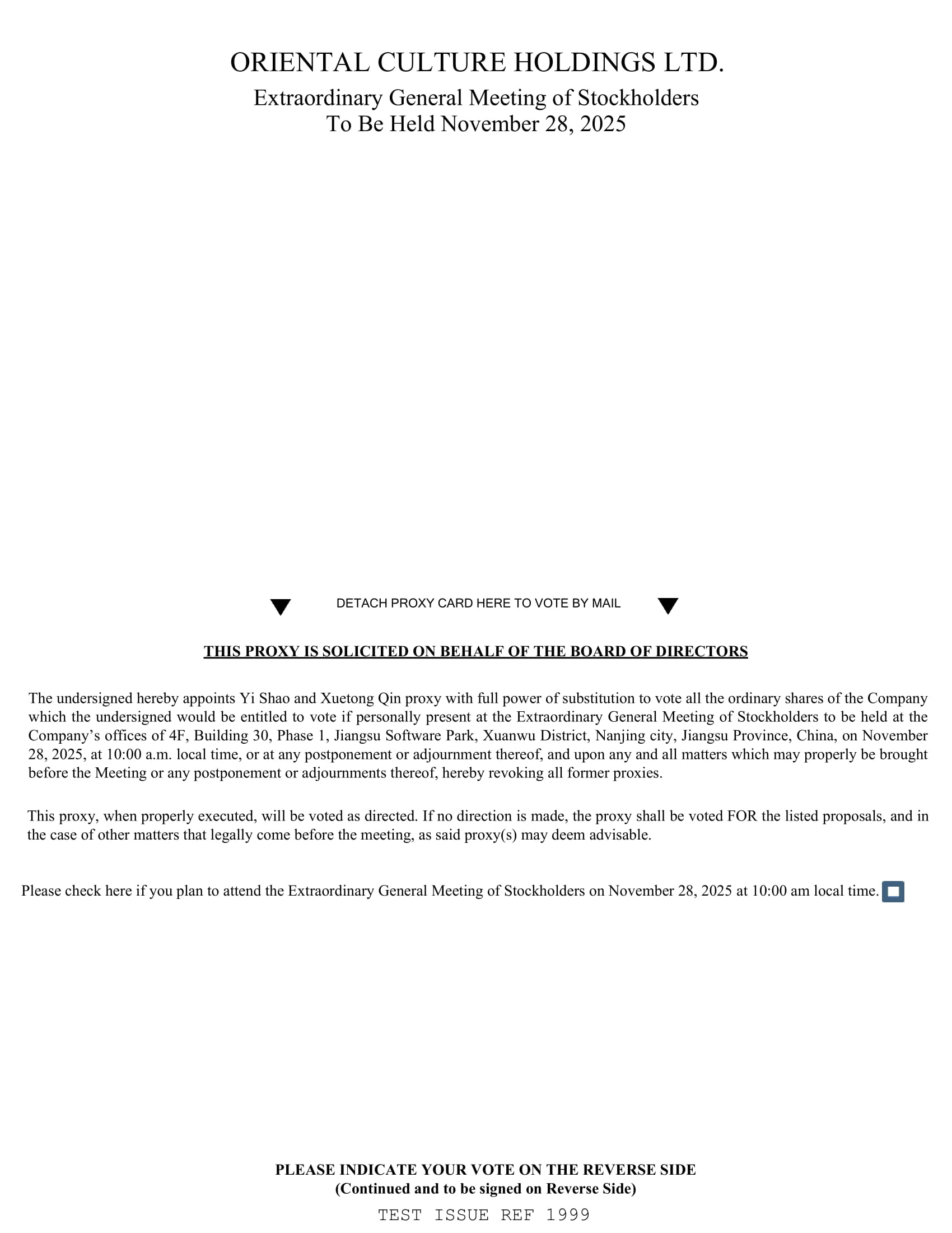 ORIENTAL CULTURE HOLDINGS LTD. Extraordinary General Meeting of Stockholders To Be Held November 28, 2025 DETACH PROXY CARD HERE TO VOTE BY MAIL THIS PROXY IS SOLICITED ON BEHALF OF THE BOARD OF DIRECTORS The undersigned hereby appoints Yi Shao and Xuetong Qin proxy with full power of substitution to vote all the ordinary shares of the Company which the undersigned would be entitled to vote if personally present at the Extraordinary General Meeting of Stockholders to be held at the Company’s offices of 4 F, Building 30 , Phase 1 , Jiangsu Software Park, Xuanwu District, Nanjing city, Jiangsu Province, China, on November 28 , 2025 , at 10 : 00 a . m . local time, or at any postponement or adjournment thereof, and upon any and all matters which may properly be brought before the Meeting or any postponement or adjournments thereof, hereby revoking all former proxies . This proxy, when properly executed, will be voted as directed . If no direction is made, the proxy shall be voted FOR the listed proposals, and in the case of other matters that legally come before the meeting, as said proxy(s) may deem advisable . Please check here if you plan to attend the Extraordinary General Meeting of Stockholders on November 28 , 2025 at 10 : 00 am local time . PLEASE INDICATE YOUR VOTE ON THE REVERSE SIDE (Continued and to be signed on Reverse Side) TEST ISSUE REF 1999