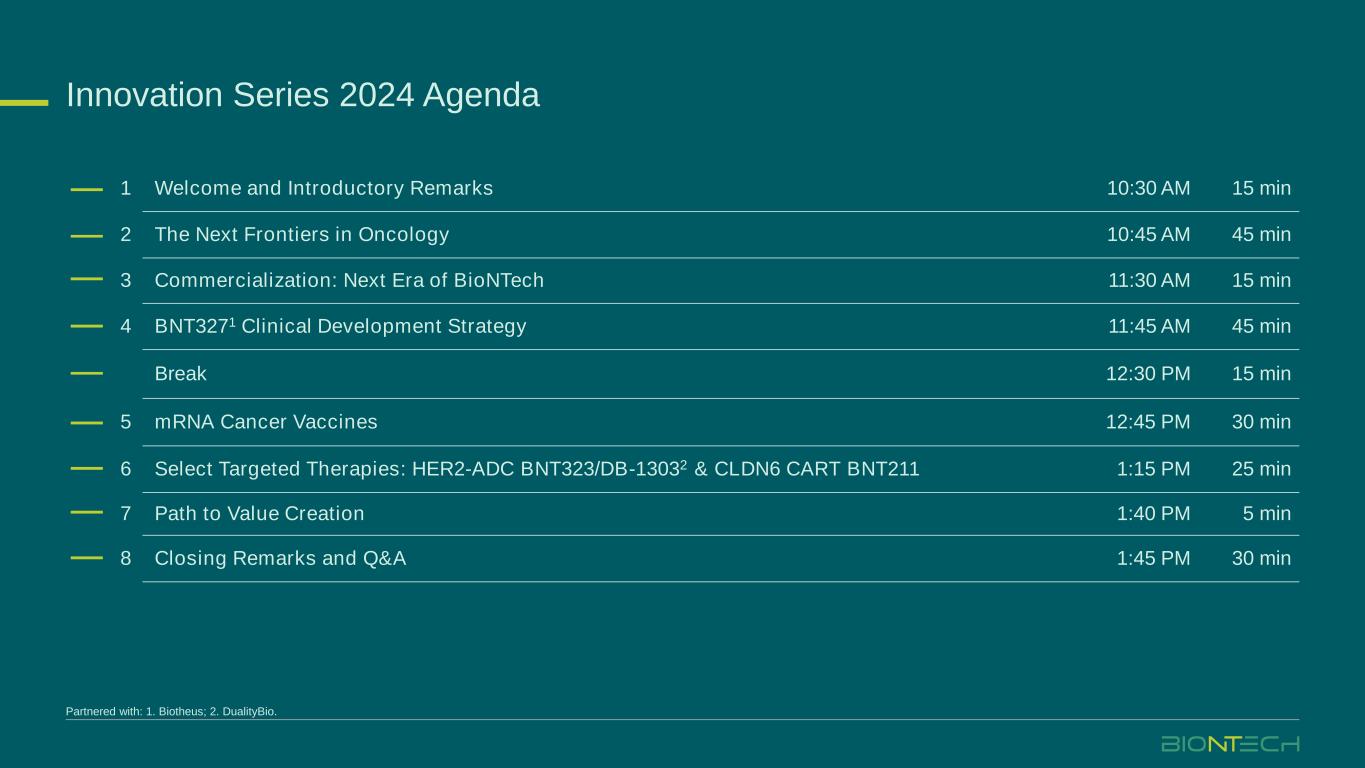 Innovation Series 2024 Agenda 1 Welcome and Introductory Remarks 10:30 AM 15 min 2 The Next Frontiers in Oncology 10:45 AM 45 min 3 Commercialization: Next Era of BioNTech 11:30 AM 15 min 4 BNT3271 Clinical Development Strategy 11:45 AM 45 min Break 12:30 PM 15 min 5 mRNA Cancer Vaccines 12:45 PM 30 min 6 Select Targeted Therapies: HER2-ADC BNT323/DB-13032 & CLDN6 CART BNT211 1:15 PM 25 min 7 Path to Value Creation 1:40 PM 5 min 8 Closing Remarks and Q&A 1:45 PM 30 min Partnered with: 1. Biotheus; 2. DualityBio.