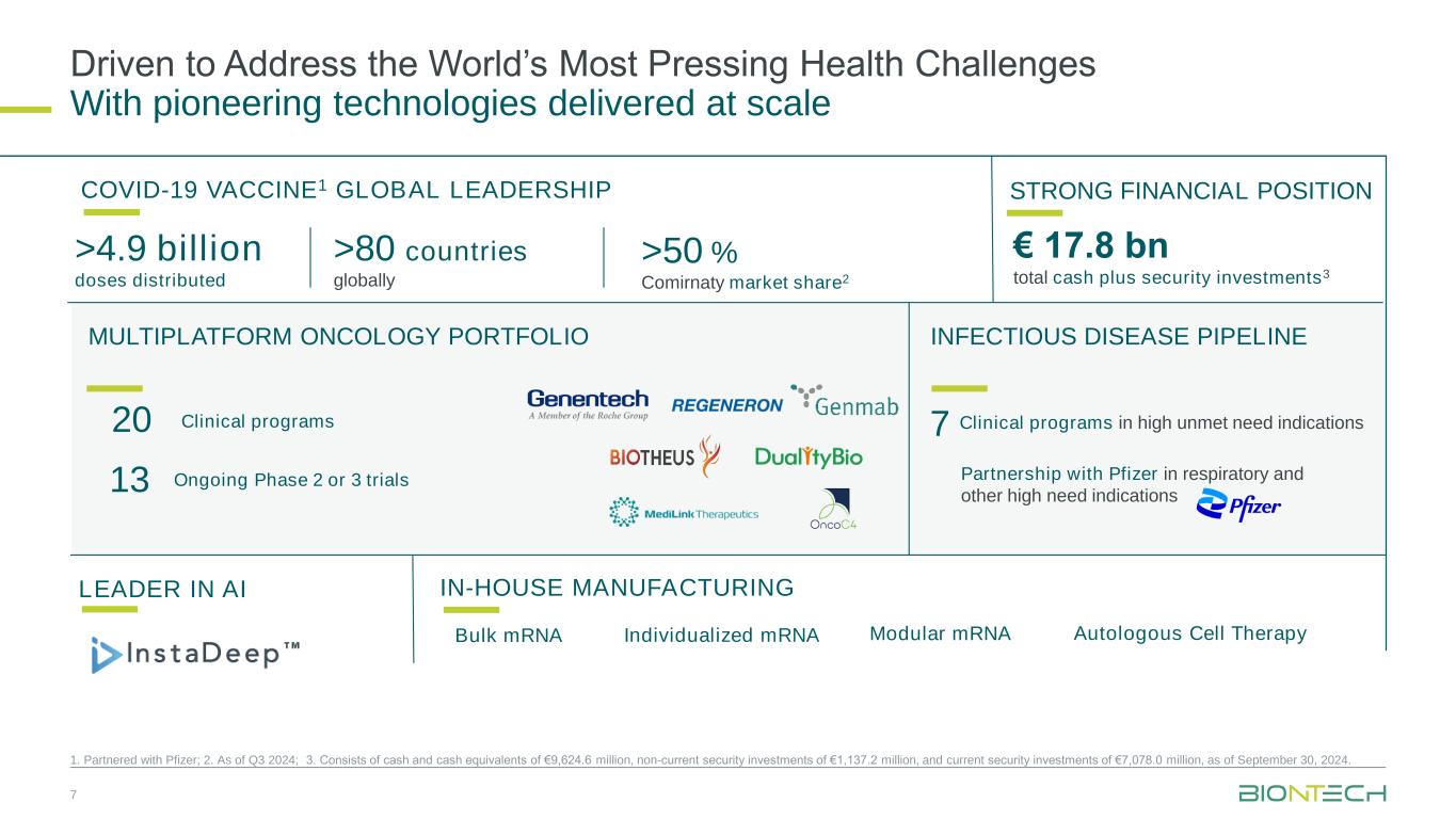 BioNTech’s Journey Partnered with 1. Pfizer; 2. Genentech, a member of the Roche Group; 3. DualityBio. Entering a new stage of value creation for patients, society and shareholders 2008 Founding & Platform Building Seed financing & first collaborations 2019 Nasdaq IPO 2020-2022 COMIRNATY®1 Development, approval & worldwide launch From 2023 Advancing towards becoming a multi-product biotechnology company 6 BNT327/PM80021 Autogene cevumeran2 BNT211 (CAR-T) BNT323/DB-13033 FixVac