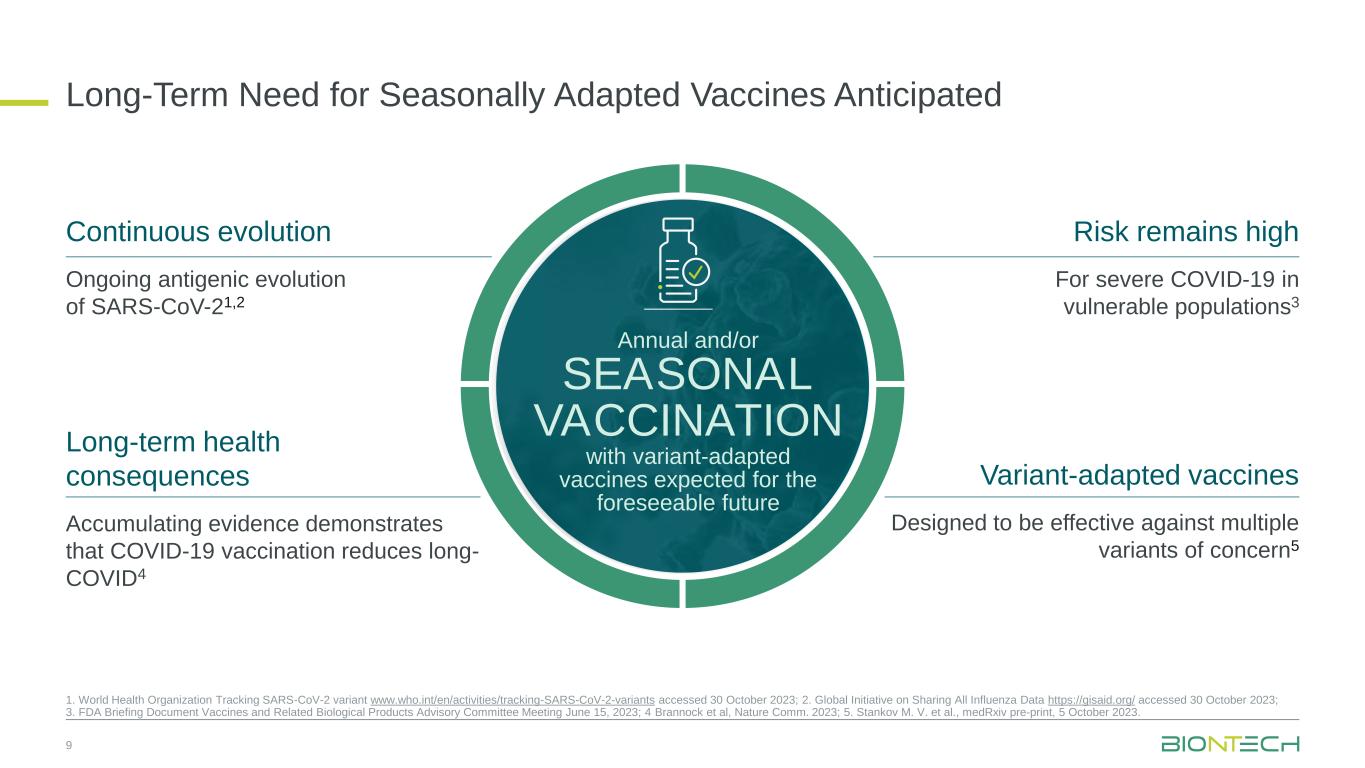 8 >4.9 billion doses of BNT162b2 shipped >180 countries and territories3 The fastest vaccine development in the history of medicine1 The strongest launch of any pharmaceutical product2 Developing and Approving the First mRNA Medicine 1. Ball P. Nature. 2021; 2. Measured by sales recorded for a single product in a single year (>$40 billion combined of direct sales recorded by Pfizer or BioNTech in both 2021 and 2022); 3. Cumulative doses shipped in the years 2021, 2022 and 2023.