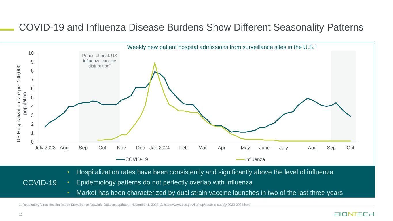 Variant-adapted vaccines Designed to be effective against multiple variants of concern5 Long-term health consequences Accumulating evidence demonstrates that COVID-19 vaccination reduces long- COVID4 Continuous evolution Ongoing antigenic evolution of SARS-CoV-21,2 Risk remains high For severe COVID-19 in vulnerable populations3 Long-Term Need for Seasonally Adapted Vaccines Anticipated 9 1. World Health Organization Tracking SARS-CoV-2 variant www.who.int/en/activities/tracking-SARS-CoV-2-variants accessed 30 October 2023; 2. Global Initiative on Sharing All Influenza Data https://gisaid.org/ accessed 30 October 2023; 3. FDA Briefing Document Vaccines and Related Biological Products Advisory Committee Meeting June 15, 2023; 4 Brannock et al, Nature Comm. 2023; 5. Stankov M. V. et al., medRxiv pre-print, 5 October 2023. Annual and/or SEASONAL VACCINATION with variant-adapted vaccines expected for the foreseeable future