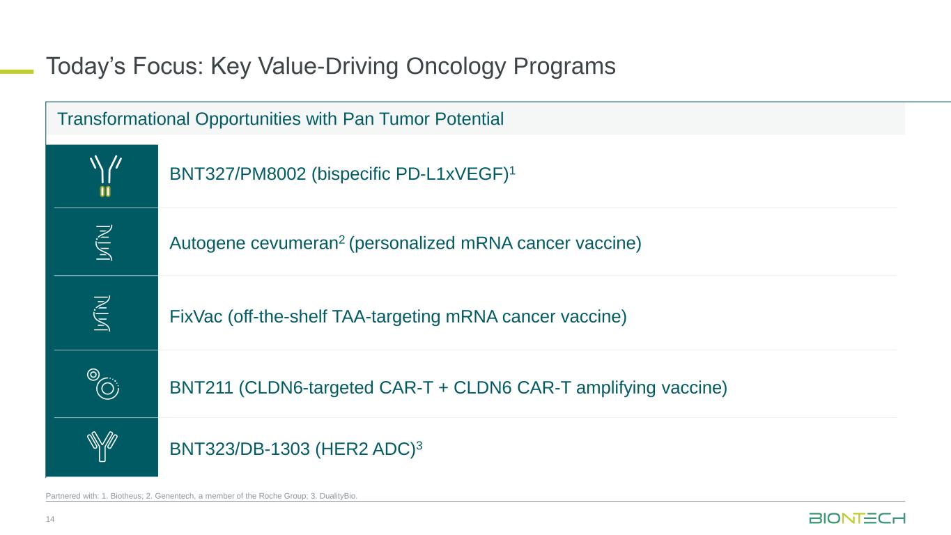 Leveraging COVID-19 Vaccine Business Model for Sustainable Value Creation 13 1. Partnered with Pfizer. Multi-product portfolio First launches in oncology Data updates across pipeline Cash generative COVID-19 vaccine business1 Balance sheet Financial Strength Progressive Path Towards Value CreationInnovative R&D Engine 2025 2026 - 2028 2030