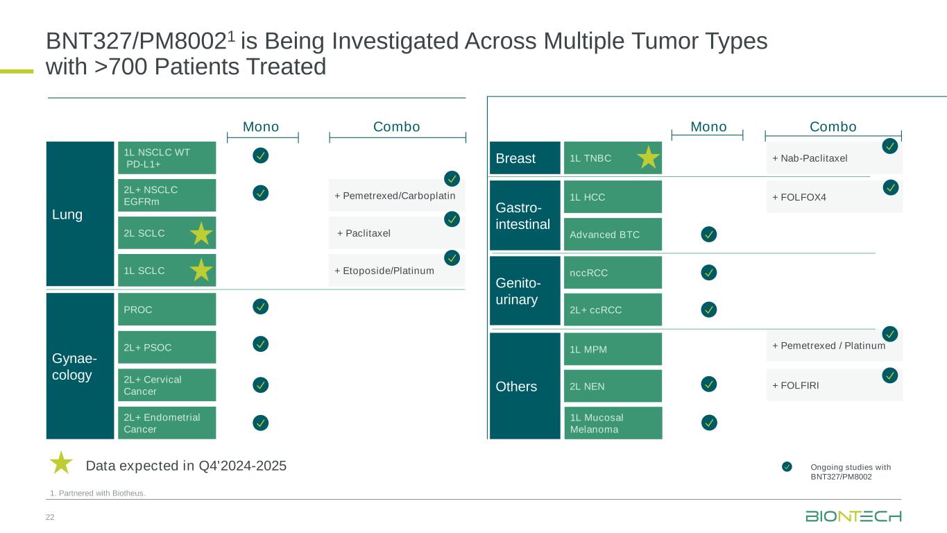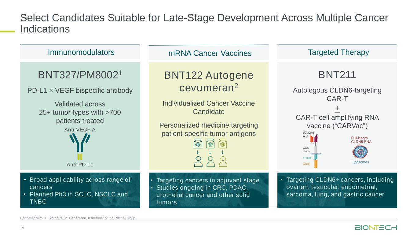 Programs Currently Evaluated in Clinical Stage 18 Targeted therapies Targeted therapy ADCs, CAR-T Immunomodulators Novel checkpoint inhibitors cytokines, immune agonists Space for curative approaches mRNA vaccines SynergySynergy Synergy Immunomodulators mRNA cancer vaccines BNT315/ GEN10535 BNT316/ ONC-3926 BNT312/ GEN10425 BNT314/ GEN10595 BNT327/ PM80023 Anti-OX40 Anti-CTLA4 Anti-4-1BB Anti- CD40 / Anti-4-1BB Anti-EpCAM / Anti-PD-L1 / Anti-VEGF BNT151 BNT152 BNT153 Ribocytokines IL2, IL7 iNeST FixVac individualized Neoantigen-Specific immunoTherapy BNT111 Melanoma BNT113 HNSCC BNT116 Lung Cancer BNT122/ RO71984574 BNT324/ DB-13111 BNT323/ DB-13031 BNT325/ DB-13051 BNT326/ YL2022 Anti-HER2 ADC Anti-B7-H3 ADC Anti-TROP2 ADC Anti-HER3 ADC BNT211 CAR-T Anti-CLDN6 CAR-T BNT141 BNT142 Ribomabs Anti- CLDN6 Anti-CLDN18.2 • Adj. CRC • Adj. Pancreatic Cancer • Adj. Bladder Cancer • Advanced Melanoma Partnered with 1. DualityBio; 2. MediLink; 3. Biotheus; 4. Genentech, a member of the Roche Group; 5. Genmab; 6. OncoC4.