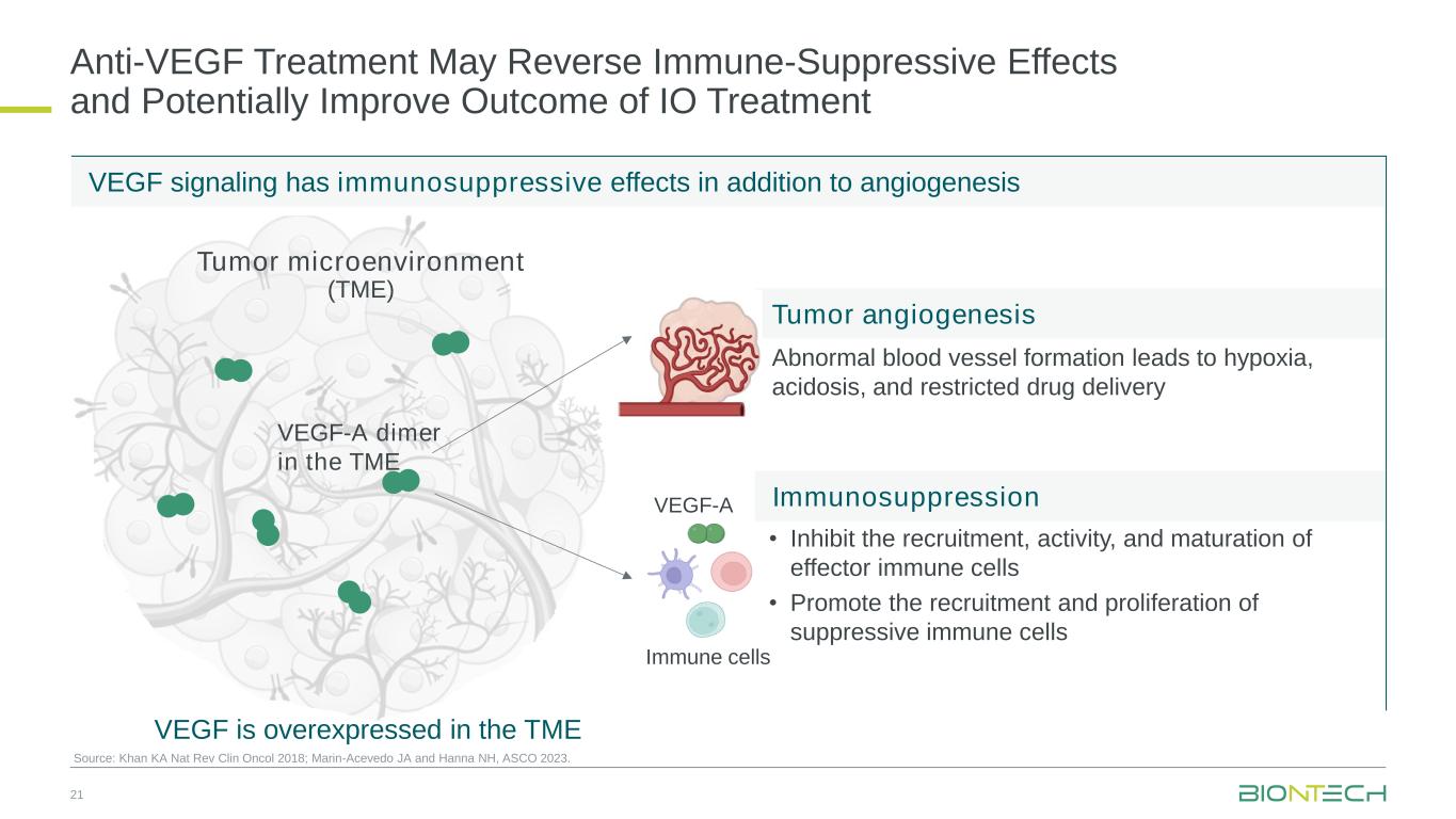 BNT327/PM80021: Synergistic Targeting of PD-L1 and VEGF 20 Targeting of PD1/PDL1 blockade to VEGF high tumors Selected NSCLC IHC3 Bispecific MOA Anti-VEGF-A (Fab) Anti-PD-L1 (VHH) VEGF-A dimer in the TME PD-L1 ligand on tumor cells Tumor microenvironment (TME) BNT327/ PM80021 VEGF-A dimer in the TME Anti-VEGF-A (Fab) Anti-PD-L1 (VHH) BNT327/PM80021 characteristics: combined tumor targeting2 PD-L1 ligand on tumor cells 1. Partnered with Biotheus; 2. Khan KA Nat Rev Clin Oncol 2018; 3. IHC data: Human Protein Atlas. VEGF-A PD-L1 Targeting of VEGF neutralization to PDL1 high tumors