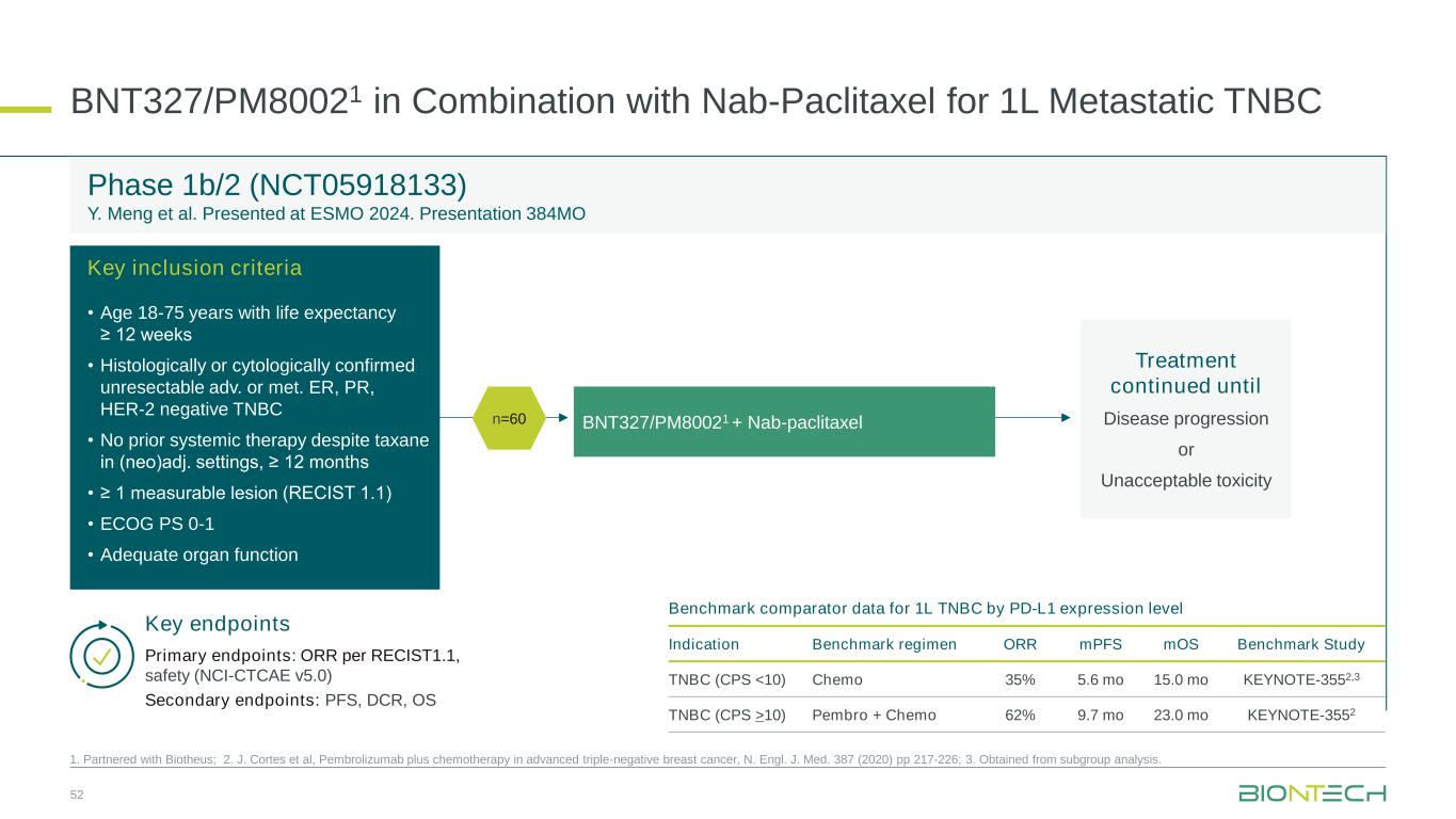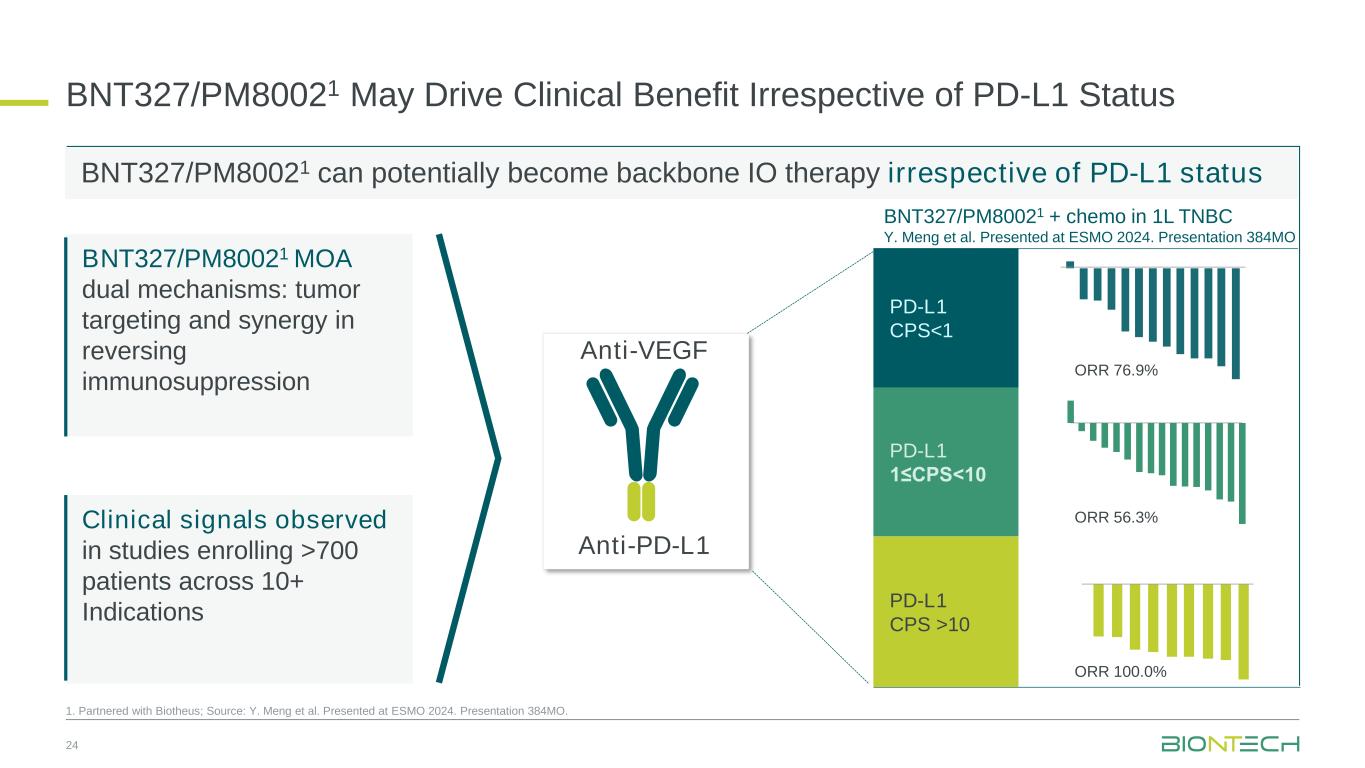 BNT327/PM80021 with nab-paclitaxel Shows Clinically Meaningful Efficacy Irrespective of PD-L1 Status in 1L TNBC 23 1. Partnered with Biotheus; 2. Cortes, J, et al. N. Engl. J. Med. 2022. *PD-L1 testing was not done in 4 patients (not shown). ORR: 75.0% and mPFS 14.0 months Variable ITT* PD-L1 CPS<1 PD-L1 1≤CPS<10 PD-L1 CPS≥10 Population (n) 42 13 16 9 ORR % 73.8 76.9 56.3 100.0 DCR % 95.2 100.0 93.8 100.0 mPFS (mo) 13.5 NR 14.0 10.8 -100 -80 -60 -40 -20 0 20 B e s t C h a n g e f ro m B a s e li n e ( % ) CPS<1 1CPS<10 CPS10 ITT population: mDoR 11.7 mos; mOS not reached Benchmark comparator data by PD-L1 expression level Indication Benchmark regimen ORR mPFS mOS Benchmark Study TNBC (CPS <10) Chemo 35% 5.6 mo 15.0 mo KEYNOTE-355 2 TNBC (CPS >10) Pembro + Chemo 62% 9.7 mo 23.0 mo KEYNOTE-355 2 Phase 1/2b (NCT05918133): clinical activity of BNT327/PM80021 in combination with nab-paclitaxel Y. Meng et al. Presented at ESMO 2024. Presentation 384MO