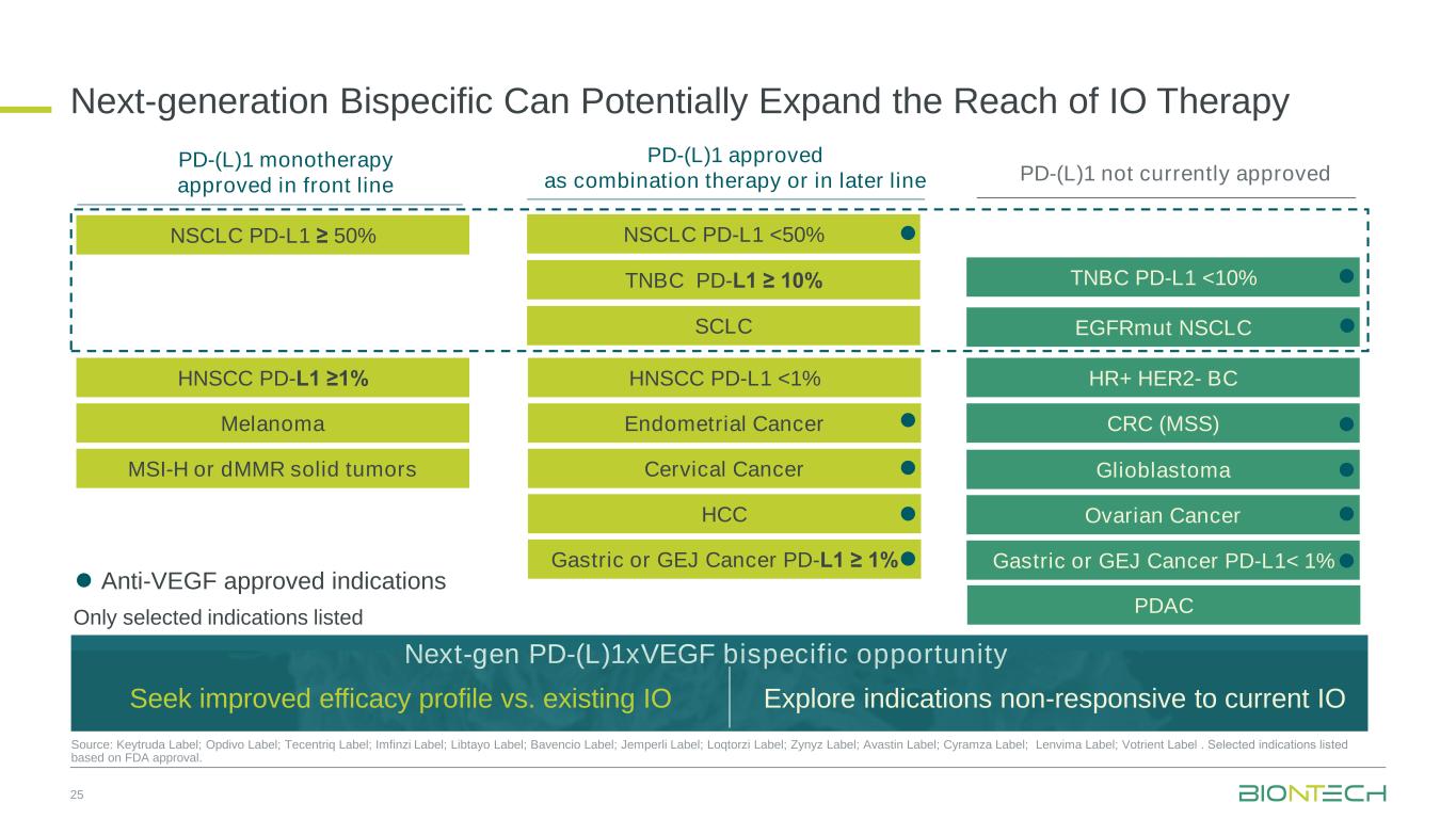 BNT327/PM80021 May Drive Clinical Benefit Irrespective of PD-L1 Status 24 1. Partnered with Biotheus; Source: Y. Meng et al. Presented at ESMO 2024. Presentation 384MO. Clinical signals observed in studies enrolling >700 patients across 10+ Indications Anti-PD-L1 BNT327/PM80021 MOA dual mechanisms: tumor targeting and synergy in reversing immunosuppression PD-L1 CPS<1 PD-L1 1≤CPS<10 Anti-VEGF BNT327/PM80021 can potentially become backbone IO therapy irrespective of PD-L1 status BNT327/PM80021 + chemo in 1L TNBC Y. Meng et al. Presented at ESMO 2024. Presentation 384MO ORR 76.9% ORR 56.3% PD-L1 CPS >10 ORR 100.0%