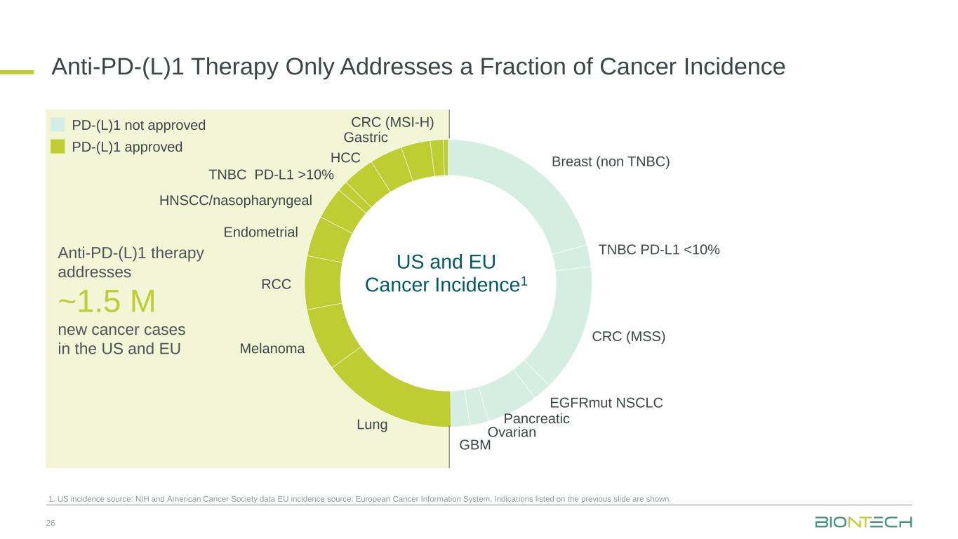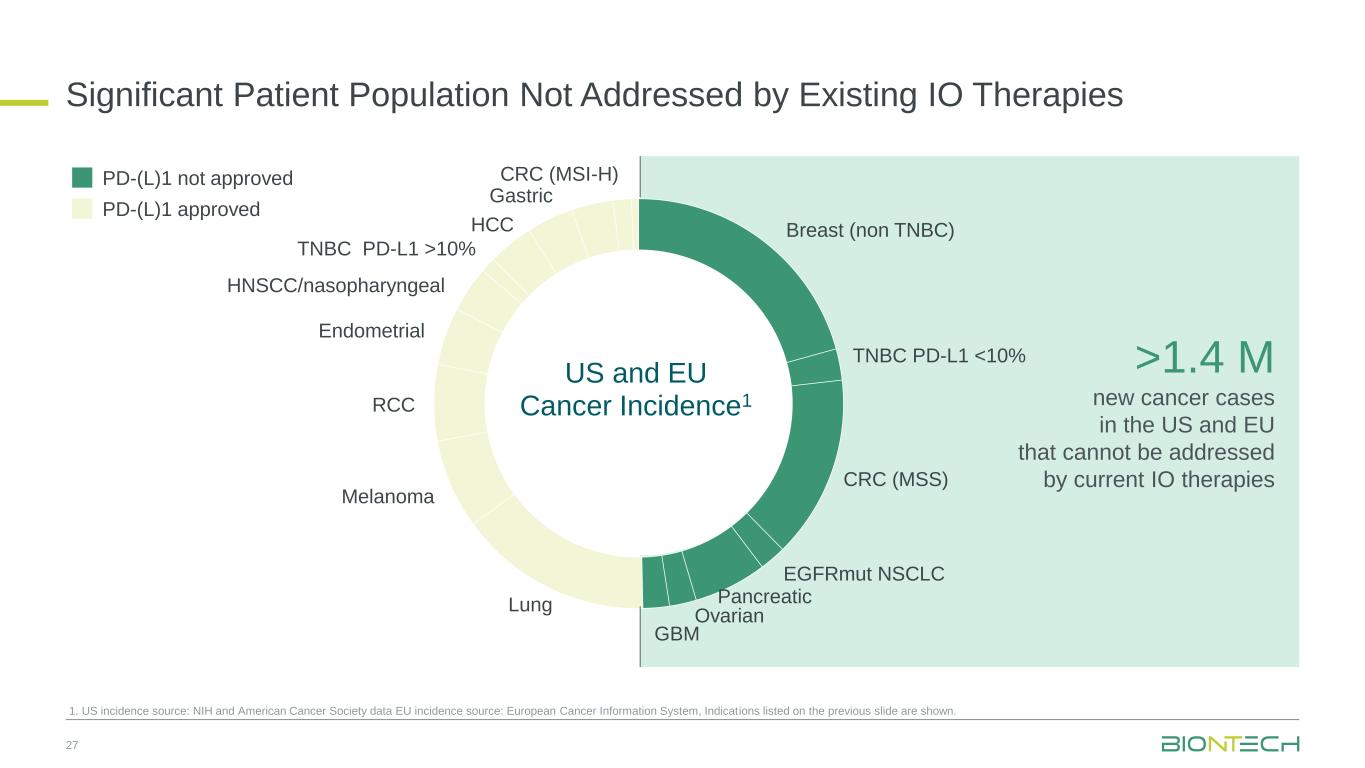 Anti-PD-(L)1 therapy addresses ~1.5 M new cancer cases in the US and EU Anti-PD-(L)1 Therapy Only Addresses a Fraction of Cancer Incidence 26 1. US incidence source: NIH and American Cancer Society data EU incidence source: European Cancer Information System, Indications listed on the previous slide are shown. Breast (non TNBC) TNBC PD-L1 <10% CRC (MSS) EGFRmut NSCLC Pancreatic Ovarian GBM Lung Melanoma RCC Endometrial HNSCC/nasopharyngeal TNBC PD-L1 >10% HCC Gastric CRC (MSI-H) US and EU Cancer Incidence1 PD-(L)1 not approved PD-(L)1 approved