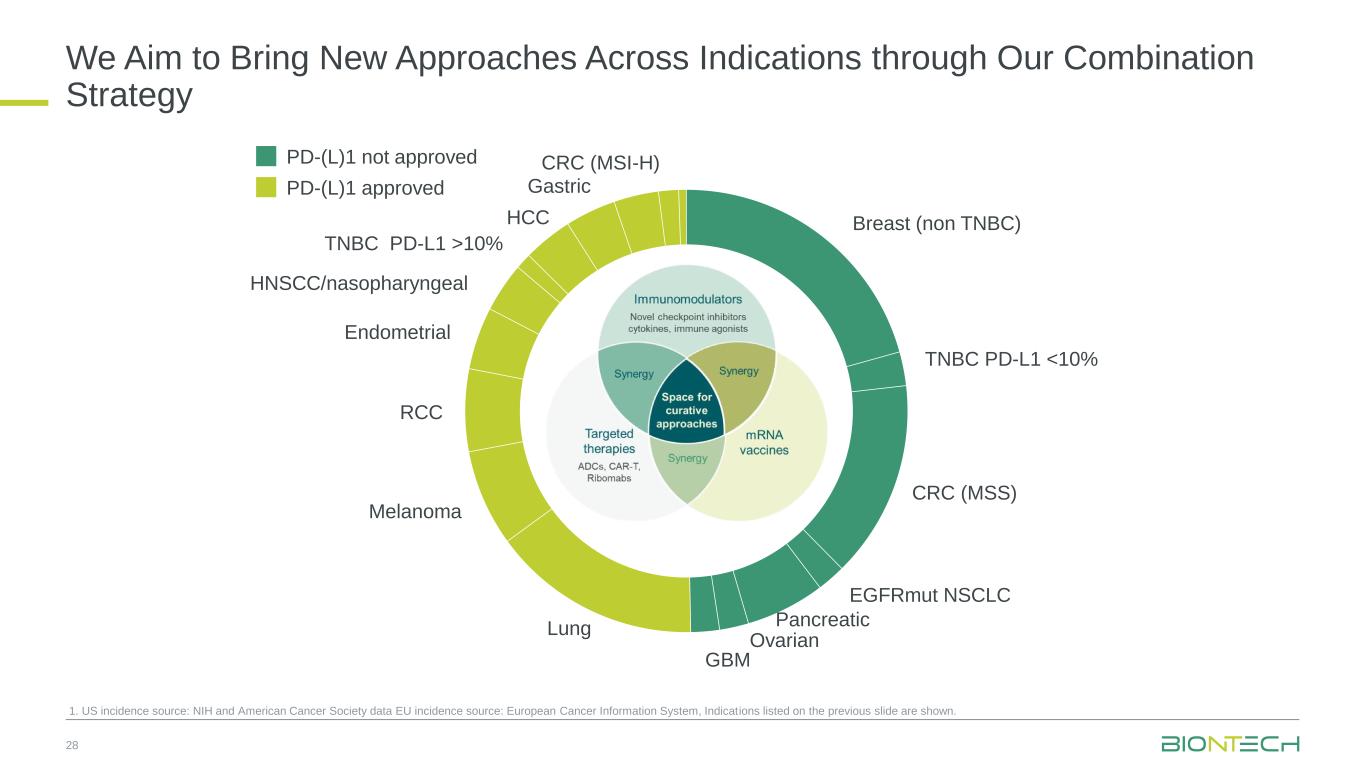 Significant Patient Population Not Addressed by Existing IO Therapies 27 1. US incidence source: NIH and American Cancer Society data EU incidence source: European Cancer Information System, Indications listed on the previous slide are shown. Breast (non TNBC) TNBC PD-L1 <10% CRC (MSS) EGFRmut NSCLC Pancreatic Ovarian GBM Lung Melanoma RCC Endometrial HNSCC/nasopharyngeal TNBC PD-L1 >10% HCC Gastric CRC (MSI-H) US and EU Cancer Incidence1 PD-(L)1 not approved PD-(L)1 approved >1.4 M new cancer cases in the US and EU that cannot be addressed by current IO therapies