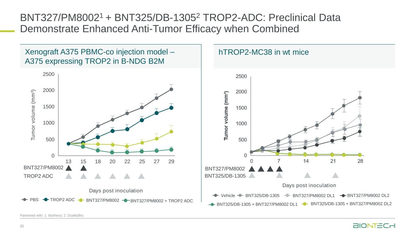 BNT327/PM80021 + BNT325/DB-13052 TROP2-ADC: Preclinical Data Demonstrate Enhanced Anti-Tumor Efficacy when Combined 30 Partnered with: 1. Biotheus; 2. DualityBio. Xenograft A375 PBMC-co injection model – A375 expressing TROP2 in B-NDG B2M hTROP2-MC38 in wt mice 0 500 1000 1500 2000 2500 T u m o r v o lu m e ( m m ³) 13 15 18 20 22 25 27 29 TROP2 ADC BNT327/PM8002 Days post inoculation BNT327/PM8002 BNT325/DB-1305 PBS TROP2 ADC BNT327/PM8002 BNT327/PM8002 + TROP2 ADC Vehicle BNT325/DB-1305 BNT327/PM8002 DL1 BNT325/DB-1305 + BNT327/PM8002 DL2 BNT327/PM8002 DL2 BNT325/DB-1305 + BNT327/PM8002 DL1 Days post inoculation