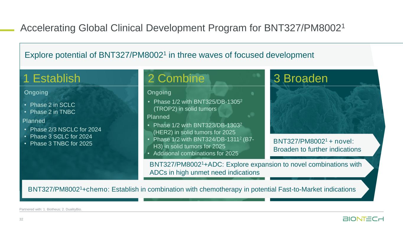 BNT327/PM80021 Clinical Development Taking Full Control of Global Rights and Clinical Programs 31 Partnered with: 1. Biotheus; 2. DualityBio; 3. Indications included in Ph2a: NSCLC, mucosal melanoma, renal cell carcinoma, endometrial cancer, cervical cancer, platinum resistant ovarian cancer. Global clinical trials China-based clinical trials BNT327/PM8002 Proven capabilities of BioNTech + Biotheus >700 patients enrolled across 10+ indications 19 clinical trials ongoing or planned, including 3 global registrational trials in 1L TNBC, SCLC, and NSCLC Indication Target population Regimen Phase Status SCLC 1L or 2L + chemo 2 Ongoing TNBC 1L or 2L + chemo 2 Ongoing SCLC 1L + chemo vs. atezolizumab + chemo 3 US IND approved NSCLC 1L + chemo vs. pembrolizumab + chemo 2/3 US IND approved TNBC 1L + chemo vs. chemo 3 Planned Selected solid tumors + BNT325/DB-13052 1/2 Ongoing Selected solid tumors + BNT324/DB-13112 1/2 US IND approved Selected solid tumors + BNT323/DB-13032 1/2 US IND approved Indication Target population Regimen Phase Status TNBC 1L + chemo vs. chemo 3 Ongoing SCLC 2L + chemo vs. chemo 3 Ongoing NSCLC 2L+ EGFRmut + chemo 2/3 Ongoing SCLC 1L + chemo 2/3 Ongoing 2L + chemo 2 Primary completion TNBC 1L + chemo 1/2 Ongoing HCC 1L + chemo 2 Ongoing 1L + TIGIT x PVRIG (PM1009) 1/2 Ongoing NEN 2L + chemo 2 Ongoing MPM 1L + chemo 2 Ongoing Advanced solid tumors3 mono 1/2 Primary completion